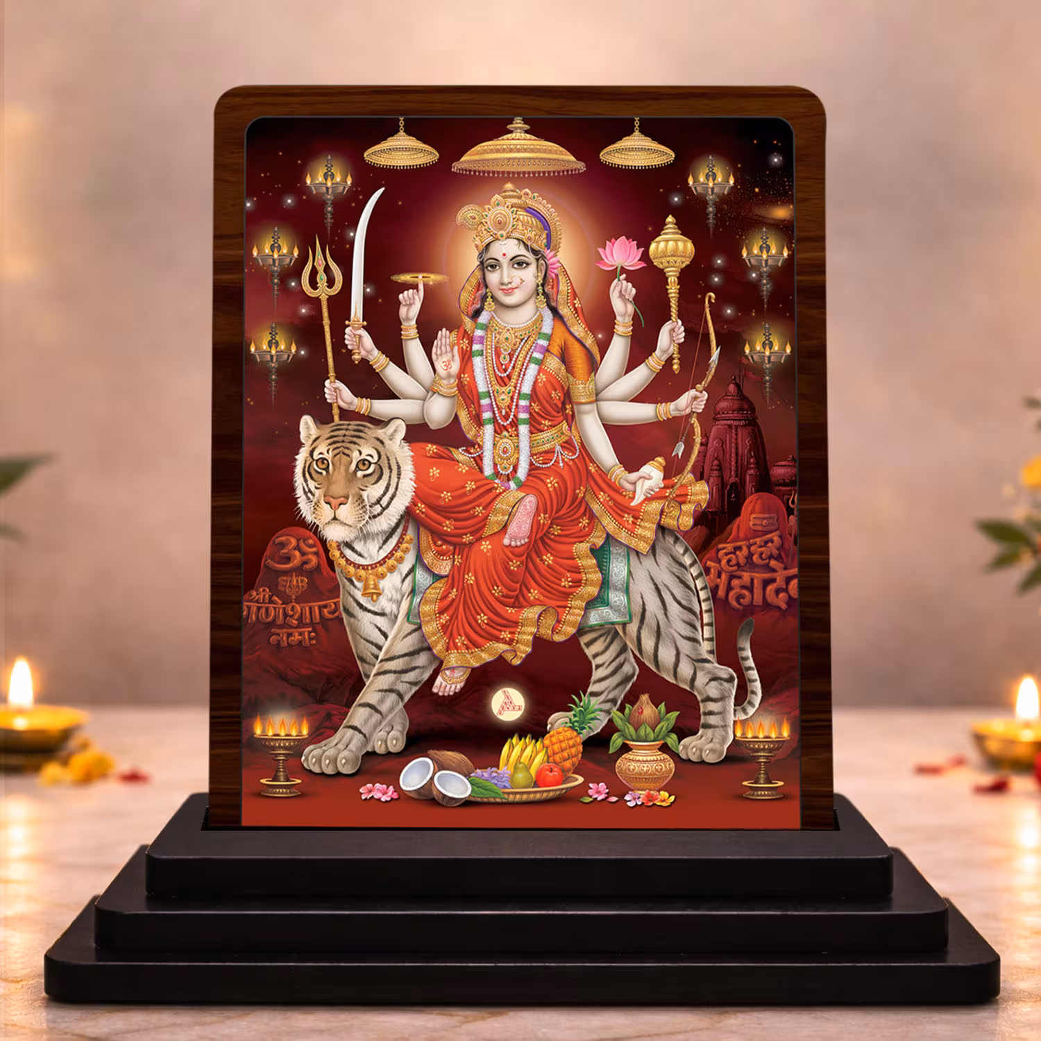 Celebrate faith in a compact format with this Durga Mata wooden idol. With its 3 x 4 inch size, wooden build, and HD printed faith inspired artwork, it offers a neat solution for pooja spaces, office tables, home d?cor themes, and thoughtful religious gifting. Its soft spiritual tones and daily darshan styling help the product stand out in compact devotional collections.