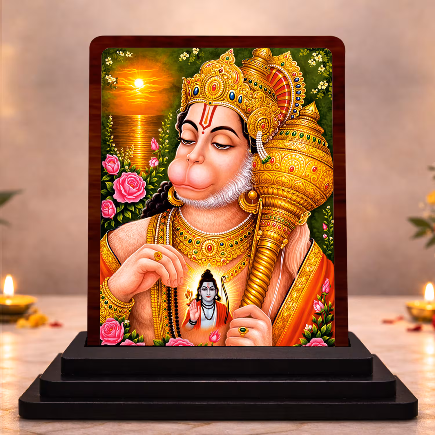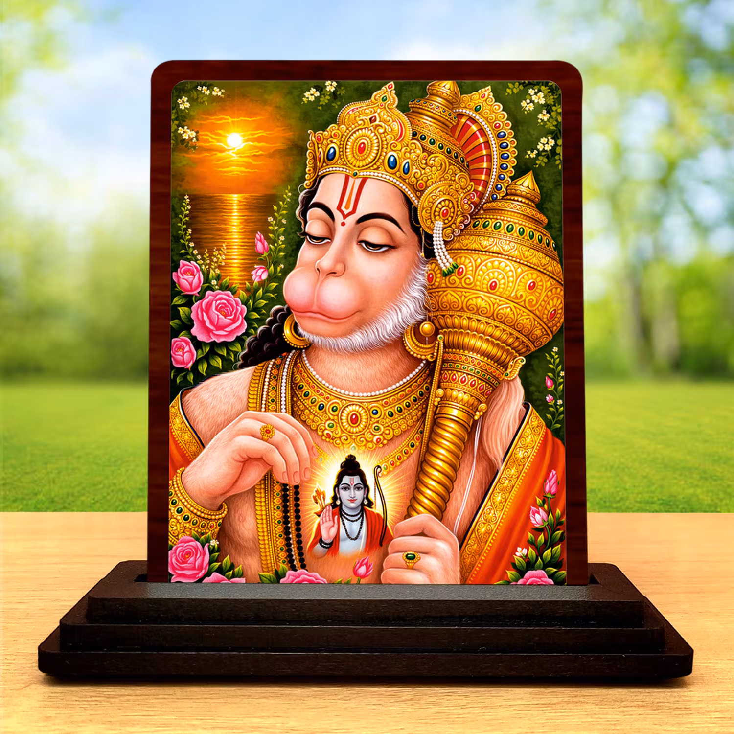 This Hanuman wooden idol is designed for buyers who want a compact yet attractive spiritual article. Built in wood and finished with HD printed vibrant devotion artwork, the 3 x 4 inch size fits easily in pooja rooms, study tables, workspaces, and religious gift hampers. Its heritage-inspired finish and gift-friendly presentation help the product stand out in compact devotional collections.