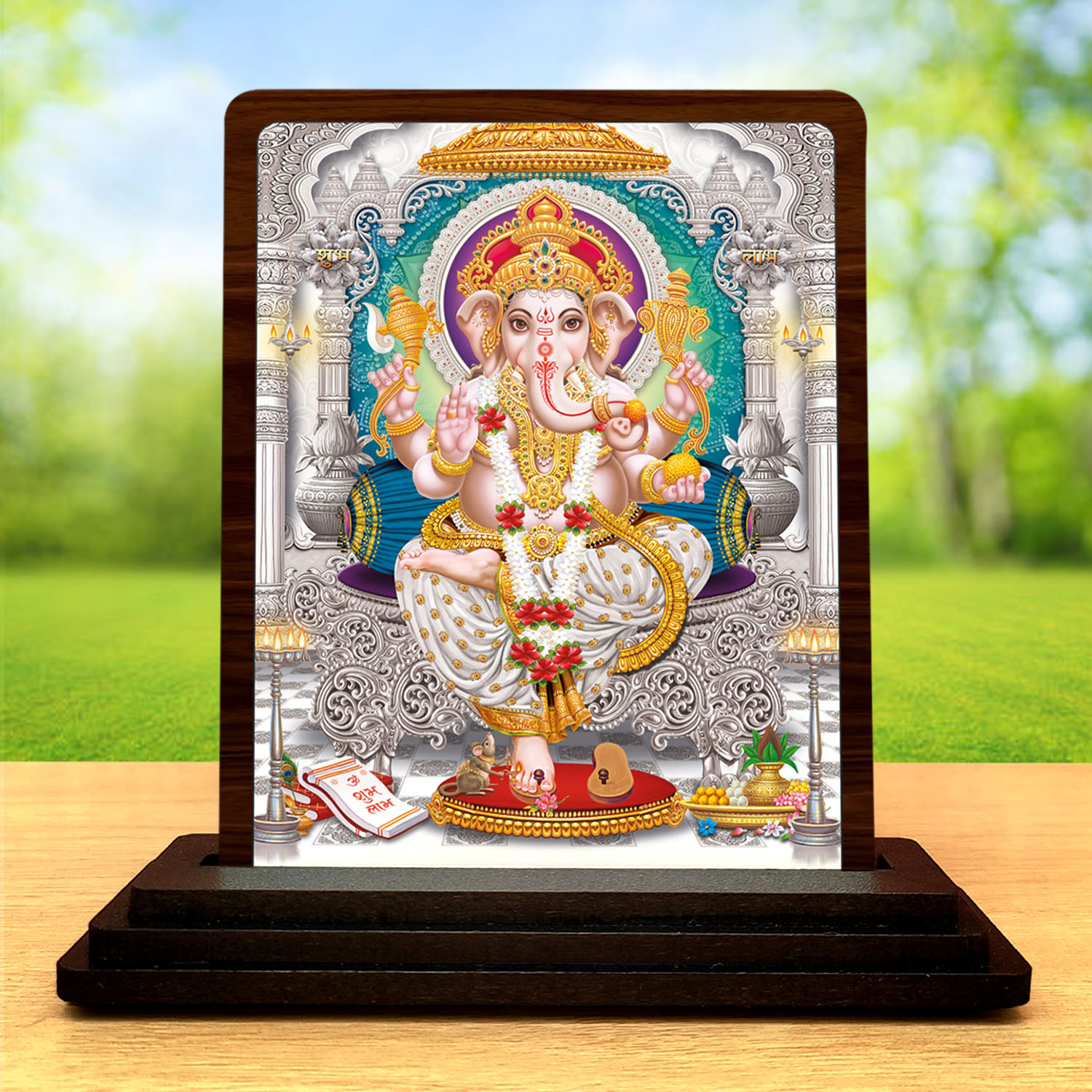This Lord Ganesha wooden idol is designed for buyers who want a compact yet attractive spiritual article. Built in wood and finished with HD printed vibrant devotion artwork, the 3 x 4 inch size fits easily in pooja rooms, study tables, workspaces, and religious gift hampers. Its bright devotional shades and gift-friendly presentation help the product stand out in compact devotional collections.