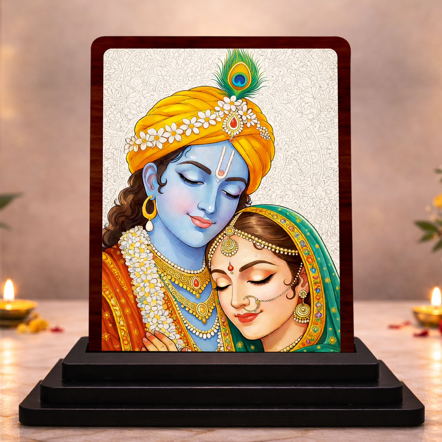 - Its HD print quality enhances the Radha Krishna image with visible detailing and a premium temple devotional presentation. It carries a gift-friendly presentation.