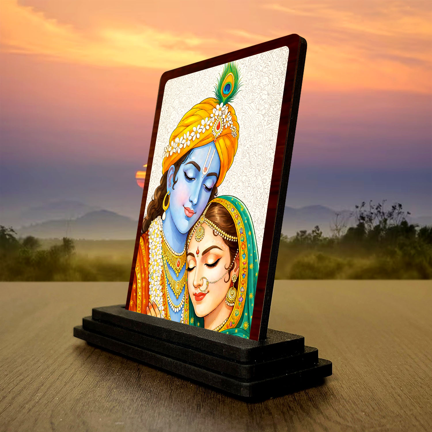 This Radha Krishna wooden idol is designed for buyers who want a compact yet attractive spiritual article. Built in wood and finished with HD printed premium temple artwork, the 3 x 4 inch size fits easily in pooja rooms, study tables, workspaces, and religious gift hampers. Its rich temple colors and gift-friendly presentation help the product stand out in compact devotional collections.