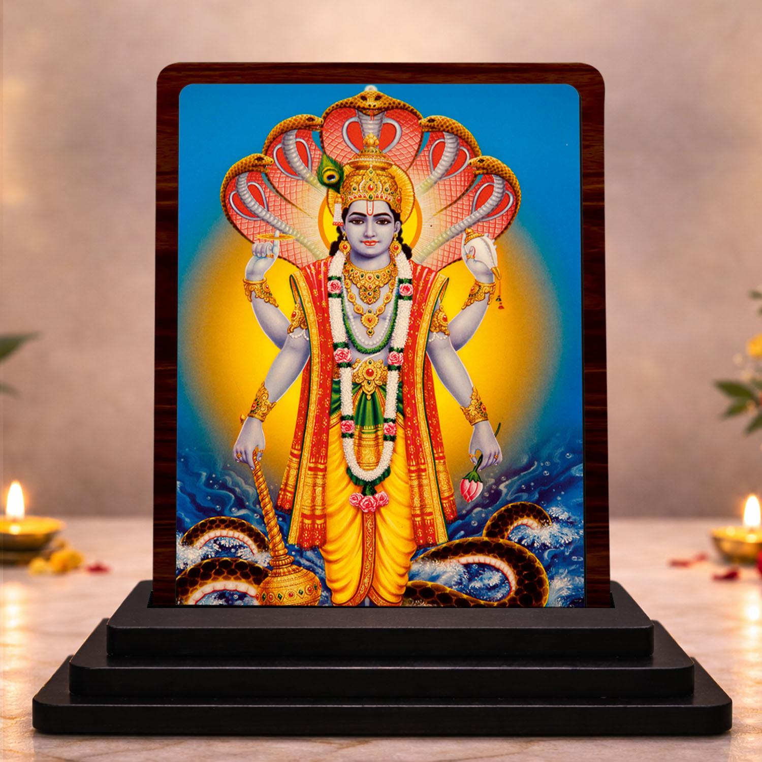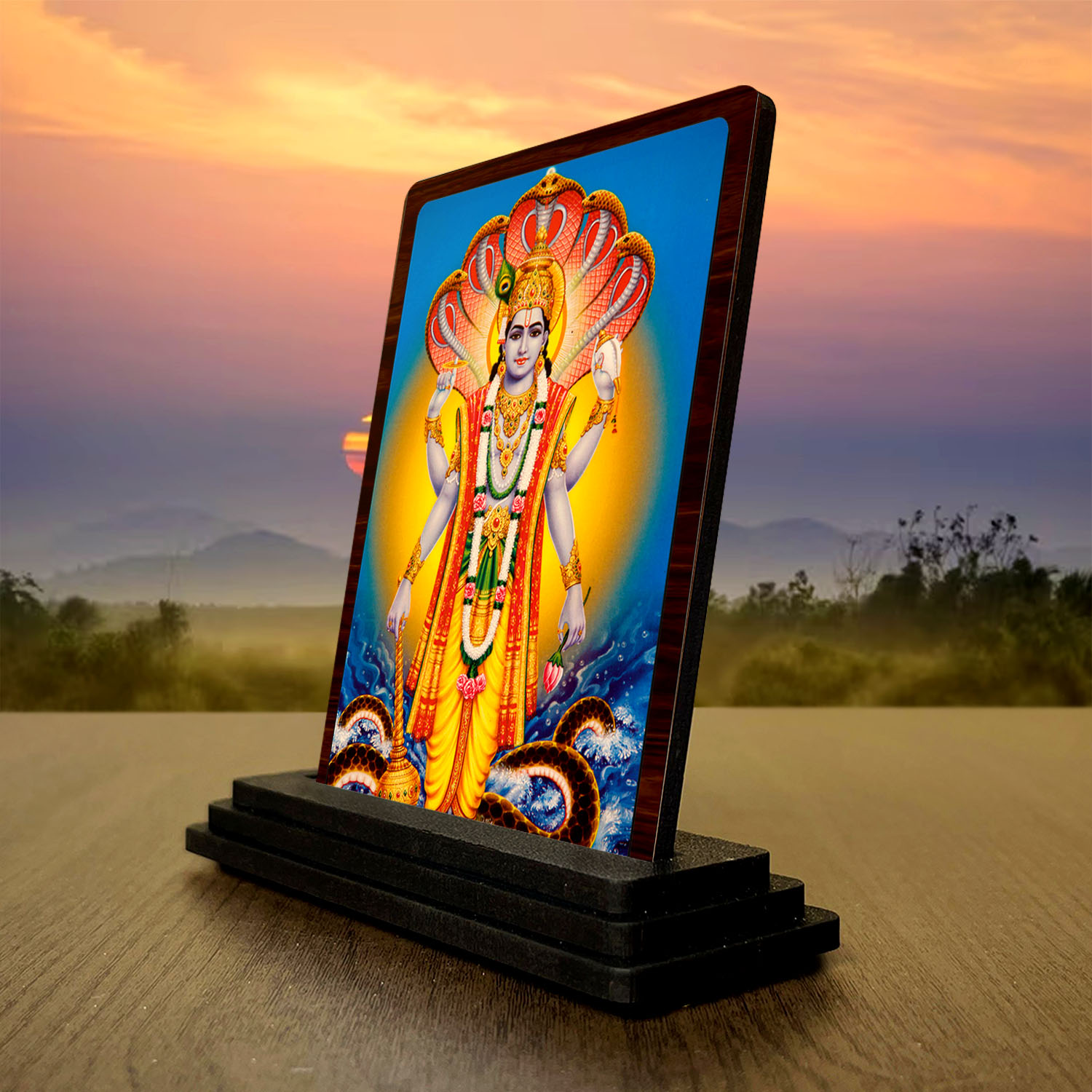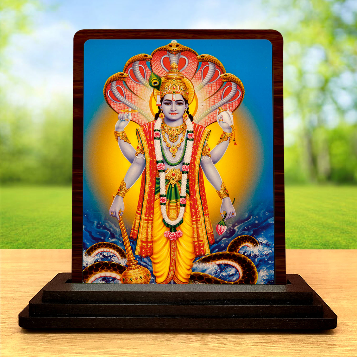 3×4 Inch Sheshnag Vishnu Wooden Idol with HD Print | Calm Energy Desk & Temple Decor
