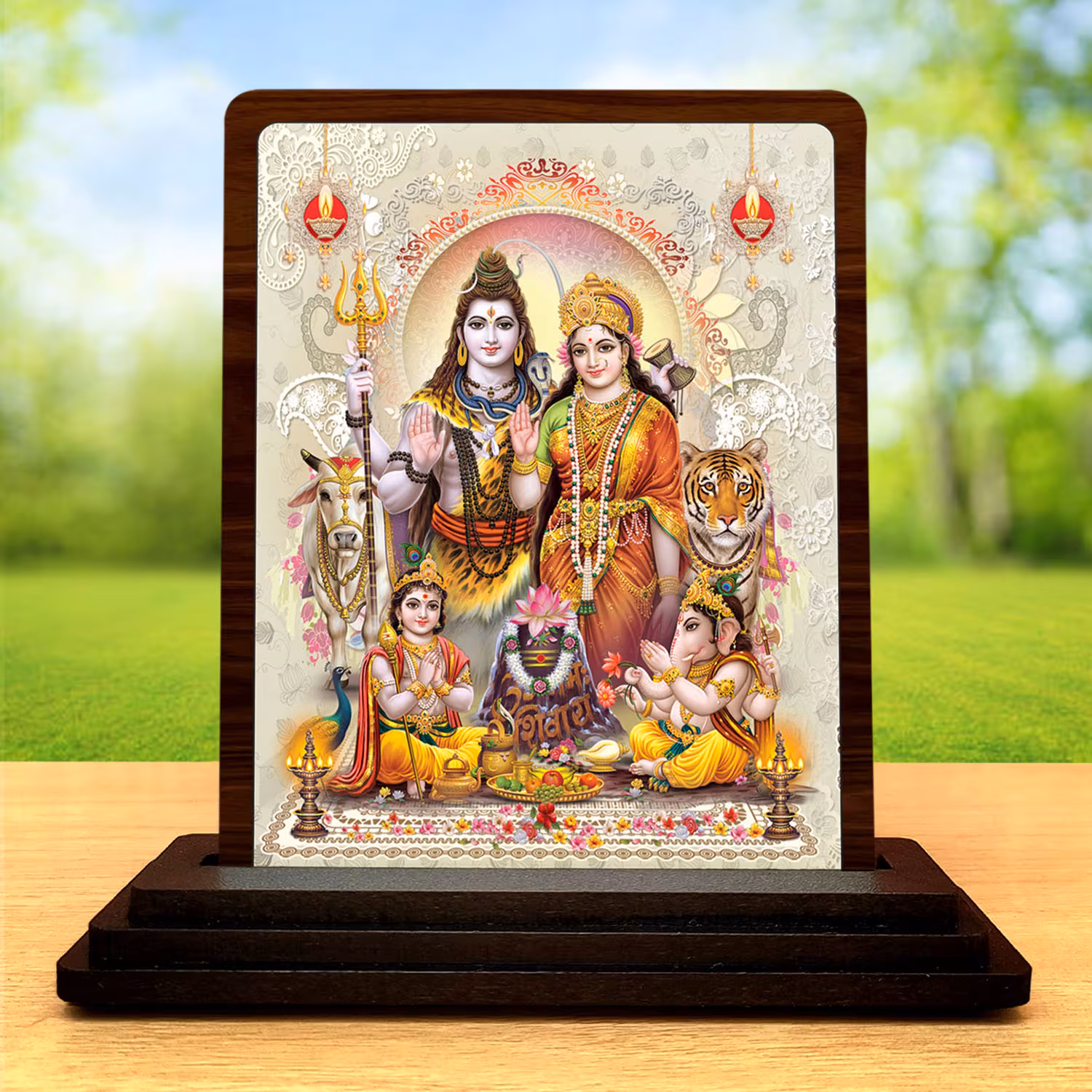 - A compact 3 x 4 inch wooden Shiv Parivar piece created for customers who want a peaceful aura devotional accent in less space. The royal darshan feel makes it visually appealing.