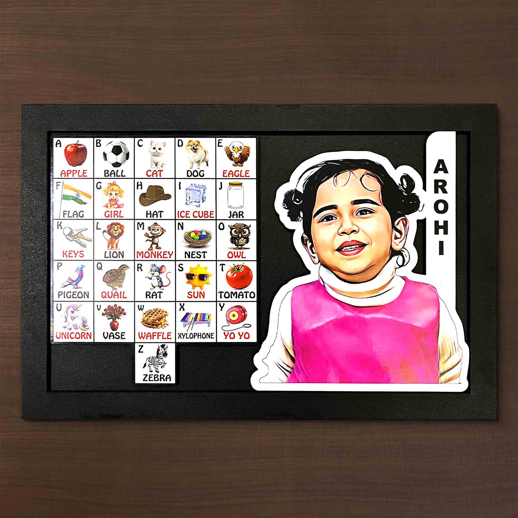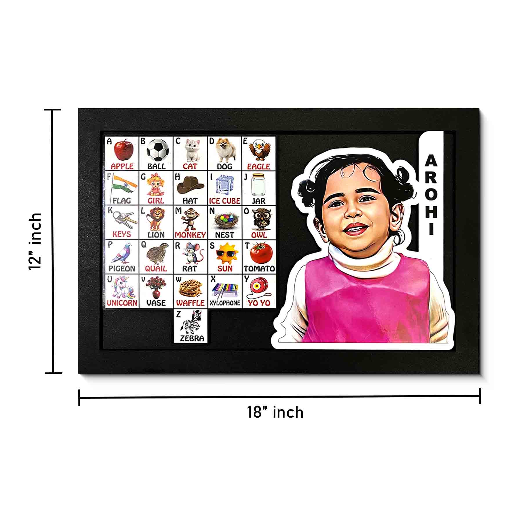 Learning Frame for Toddlers on a delightful journey through the alphabet with our “ABCs with You” personalized learning frame, designed to make early literacy fun and meaningful for your toddler! This enchanting frame features the entire alphabet from A to Z, each letter accompanied by a charming image and your customized photos.