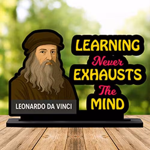 Leonardo da Vinci Motivational Tabletop Statue is a compact and inspiring d?cor piece created for people who want their desk, shelf, study table, or workspace to reflect ambition, clarity, and positive thinking. The design highlights the famous quote ?Learning Never Exhausts The Mind?, turning a simple tabletop statue into a daily visual reminder of discipline, growth, creativity, courage, and purpose. Because this piece comes in an easy-to-place 10cm x 7.5cm x 2cm format, it fits naturally into modern homes, office desks, reception counters, study corners, libraries, coaching rooms, classrooms, creative studios, and gift hampers without taking up much space.