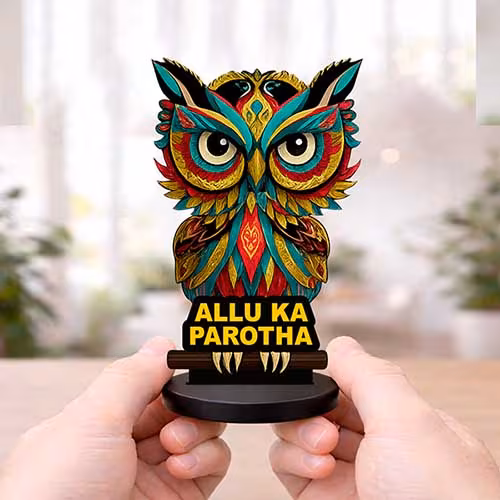 Allu Ka Parotha Owl Funny Tabletop Statue is made for people who love decor that feels playful, expressive, and instantly memorable. A bold multicolor owl character with the playful ‘Allu Ka Parotha’ theme, designed to grab instant attention on any desk or shelf. Because this piece is designed in a compact 10cm x 7.5cm x 2cm format, it sits beautifully on work desks, study tables, side shelves, reception counters, bedside corners, caf? counters, gifting hampers, and creative display setups without taking up too much space. If you are looking for a product that combines personality, visual charm, and easy placement, this design fits naturally into the world of funny desk showpiece and makes even a small area look more lively, curated, and camera-friendly.