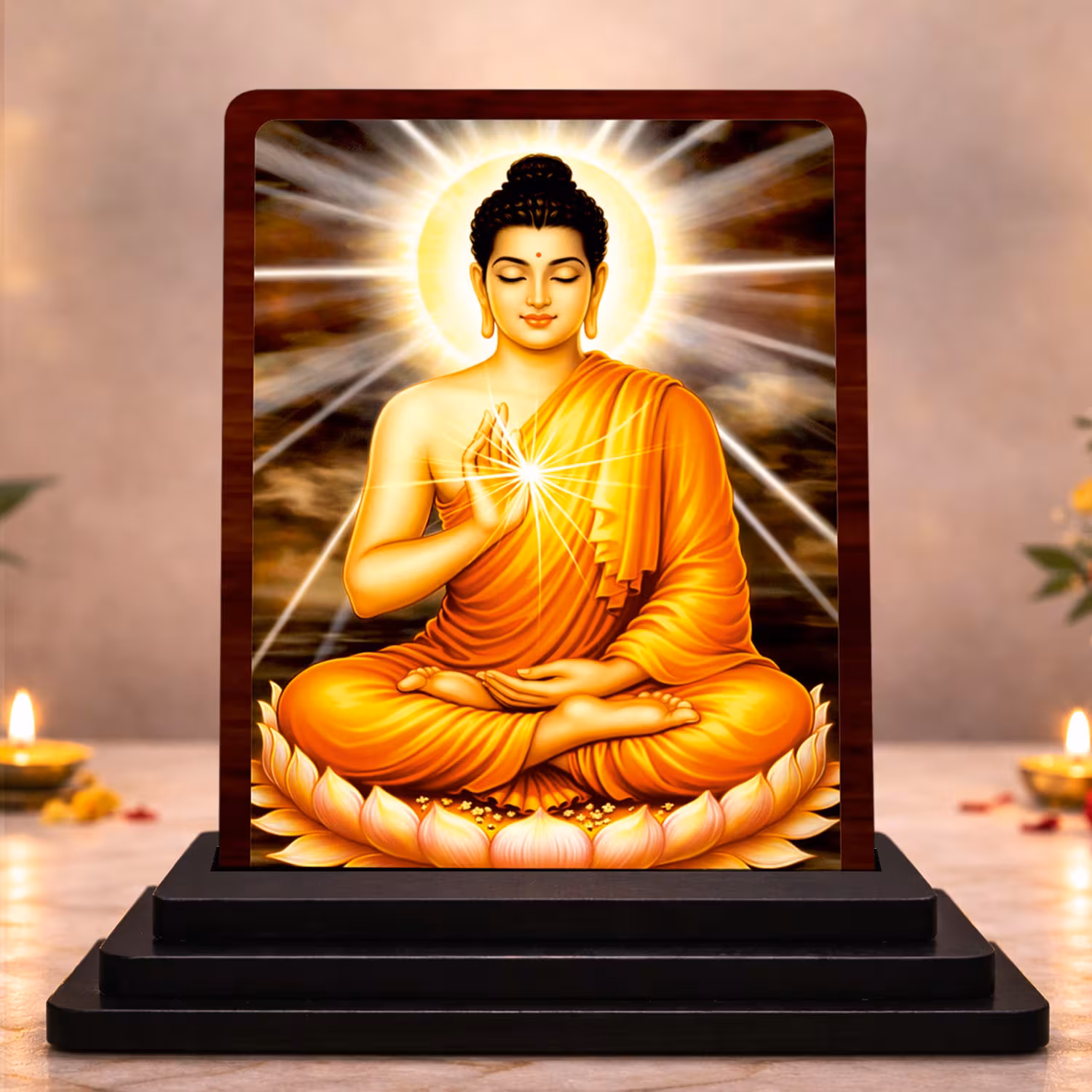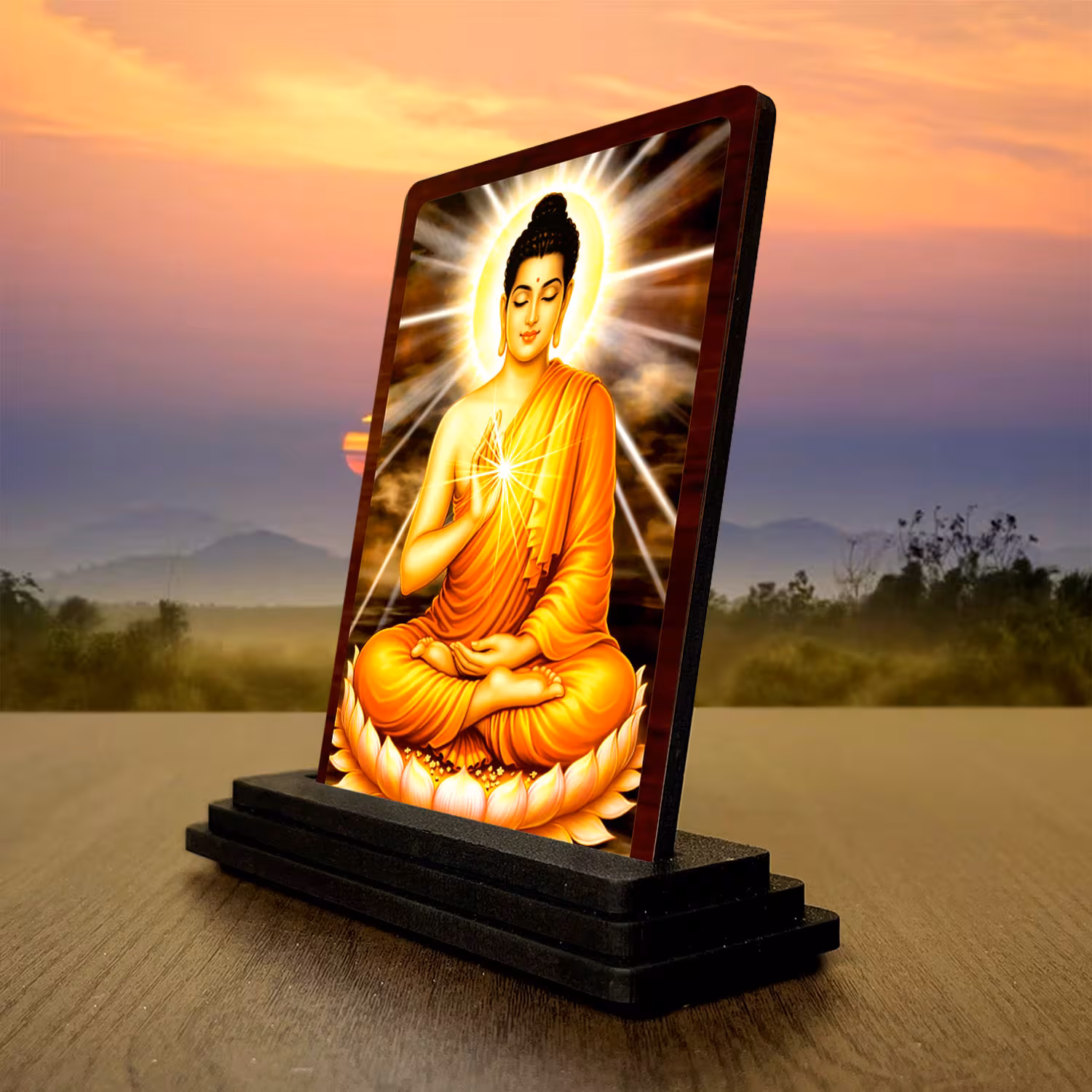 - Crisp HD printing helps this Buddha idol stand out with a clean finish and timeless prayer spiritual character. It carries a compact display appeal.