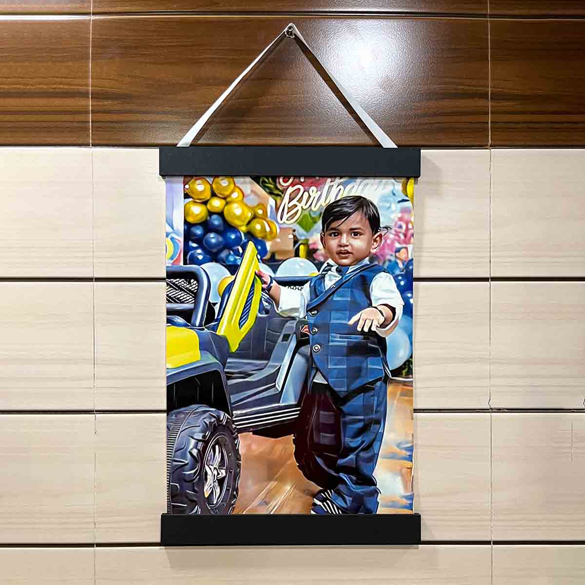 Customized Wall Hanging with HD glossy print and wooden strips. Personalize your decor with stunning, high-quality 12×18 inch artwork. Easy to hang and durable.