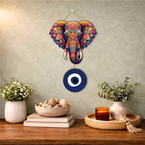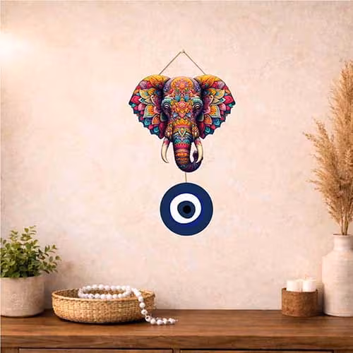Elephant Head Evil Eye Wooden Hanging is a decorative wooden hanging designed to add charm, personality, and visual warmth to your walls. This design features a multicolor elephant head design paired with an evil eye charm, making it suitable for home d?cor, office d?cor, entryway styling, bedroom walls, kids spaces, gifting, and festive decoration. Whether the buyer prefers modern artwork, cute decorative pieces, spiritual accents, or themed wall styling, this hanging brings an easy way to refresh a plain wall without major effort.