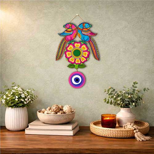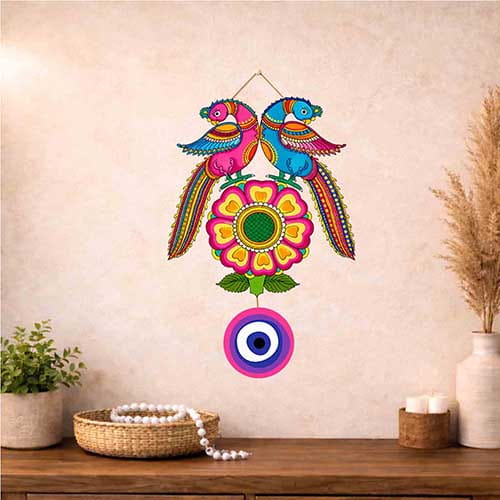 Floral Bird Evil Eye Wooden Hanging features a colorful bird and floral evil eye design for positive and vibrant decor. Ideal for living room, bedroom, entryway, office and gifting. Stylish wall hanging decor with a ready-to-display look.