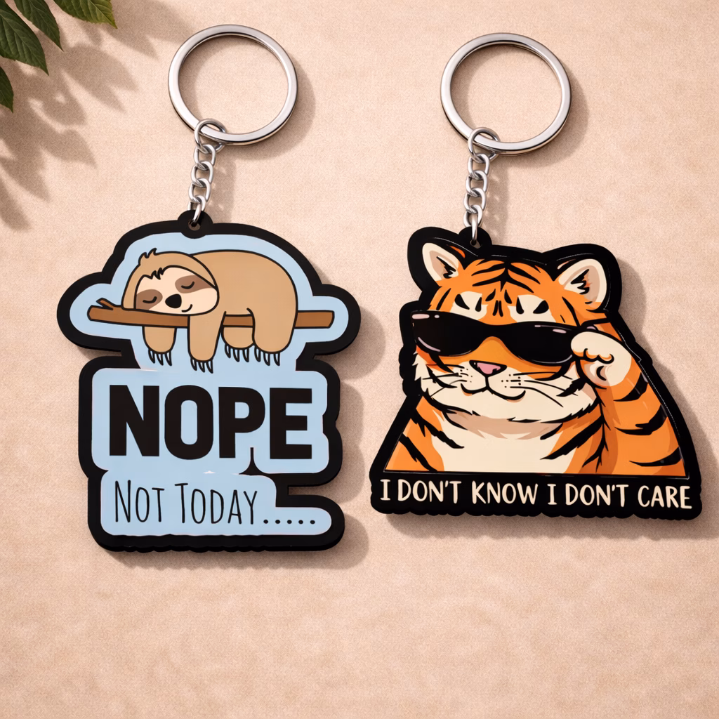 Funny Animal Quote Keychain Set | Sloth Tiger Meme Keyring by Vprint Quality is designed for shoppers who want more personality in everyday accessories. This design features a bold mix of sloth and tiger characters paired with unapologetically funny phrases for a strong meme-style statement. If you are searching for a funny quote keychain that feels stylish, expressive and gift-ready, this product is made to deliver that exact balance. Whether you attach it to home keys, office keys, backpacks, handbags, pouches, travel organizers or zipper pulls, this keychain adds visible character in a compact form. The artwork feels instantly noticeable without becoming bulky, which makes it ideal for people who love accessories that say something about their mood, taste or lifestyle.