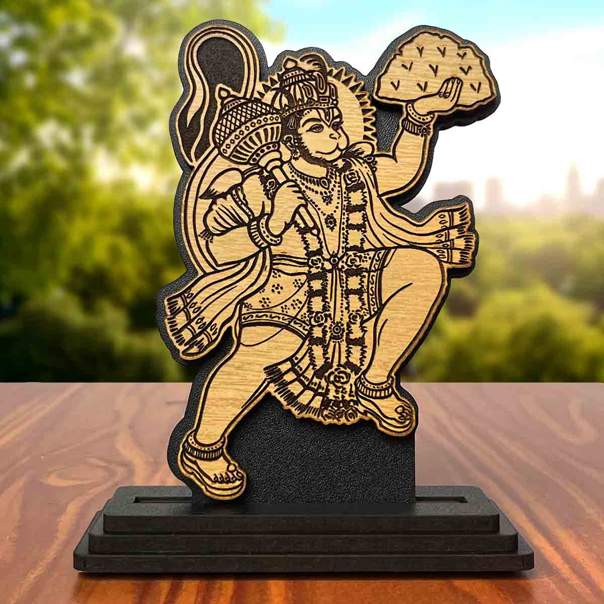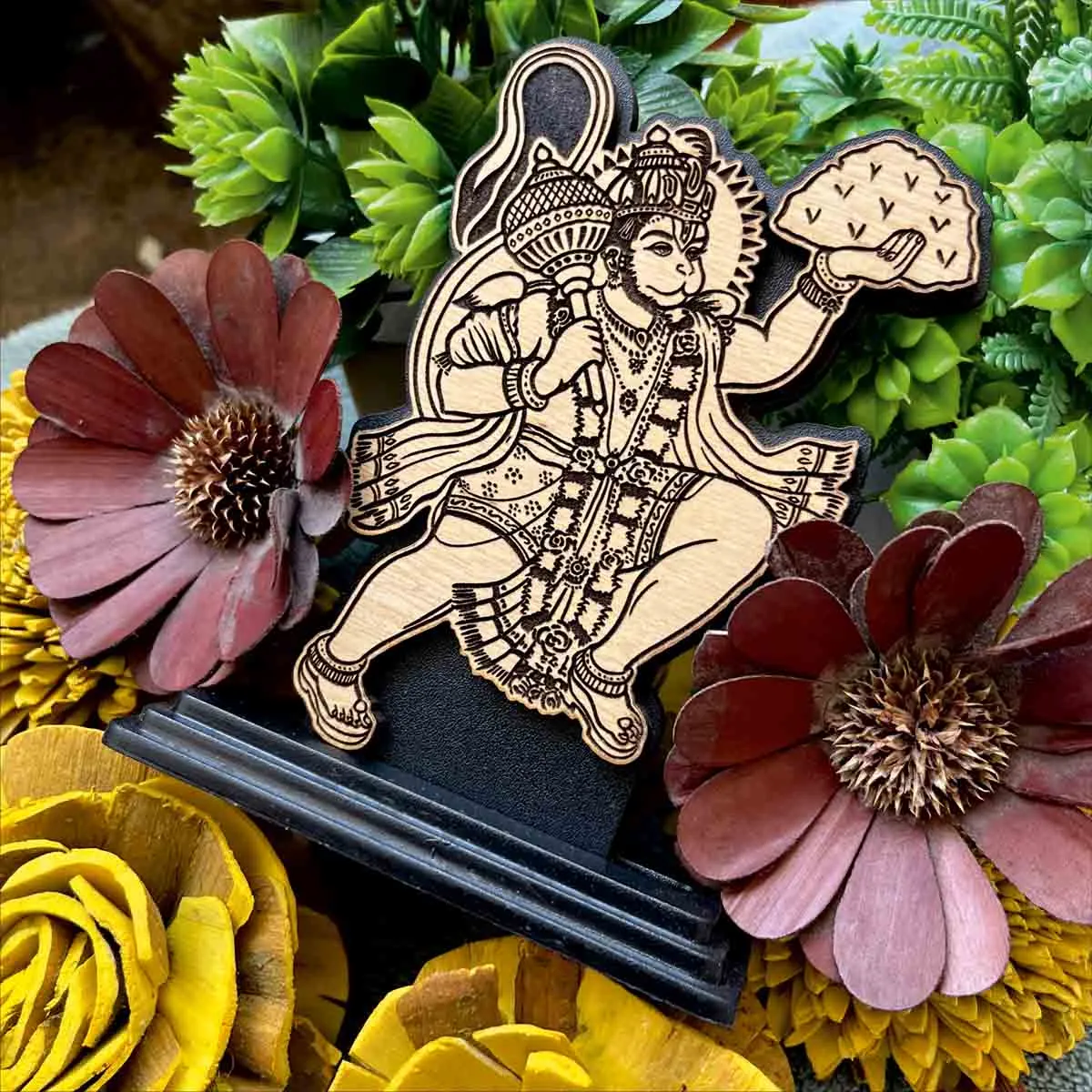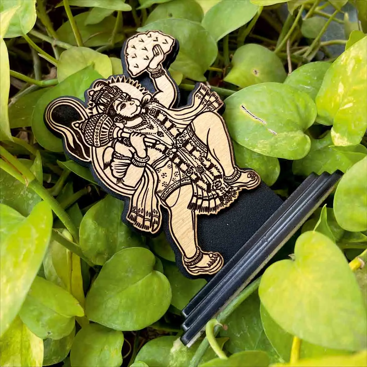 hanuman ki photo Murti Charming 4×5-inch wooden idol, expertly engraved in black and light wood tones. A small, elegant d?cor piece that adds warmth and style to any space