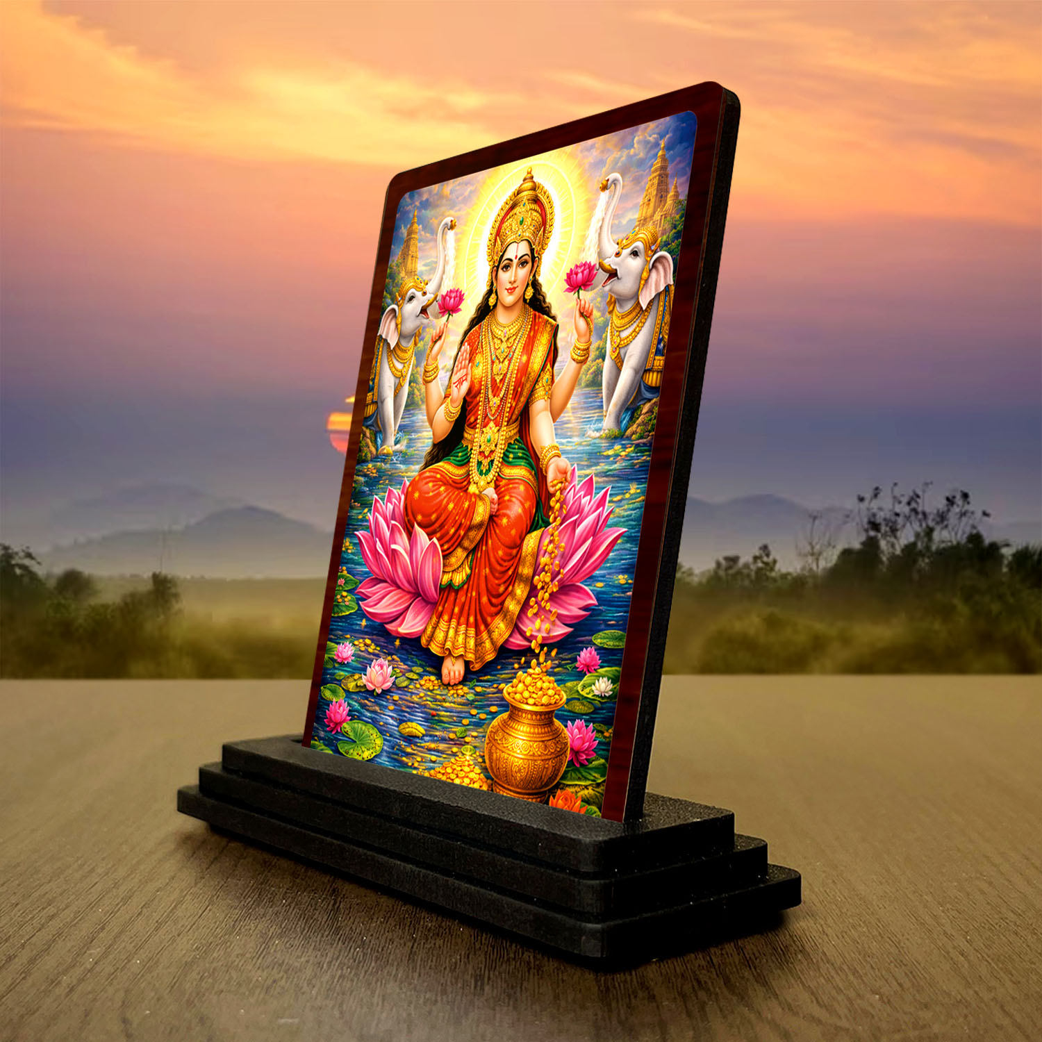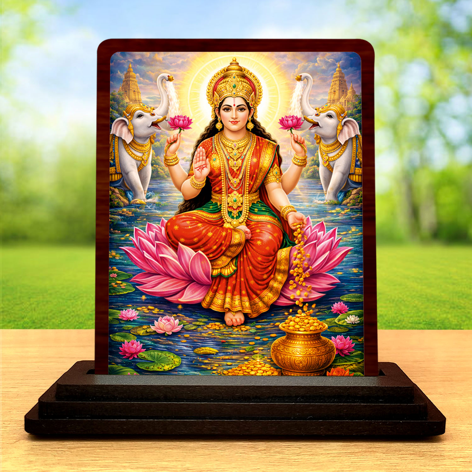 This Maa Lakshmi wooden idol is designed for buyers who want a compact yet attractive spiritual article. Built in wood and finished with HD printed traditional pooja artwork, the 3 x 4 inch size fits easily in pooja rooms, study tables, workspaces, and religious gift hampers. Its soft spiritual tones and collector-friendly appearance help the product stand out in compact devotional collections.