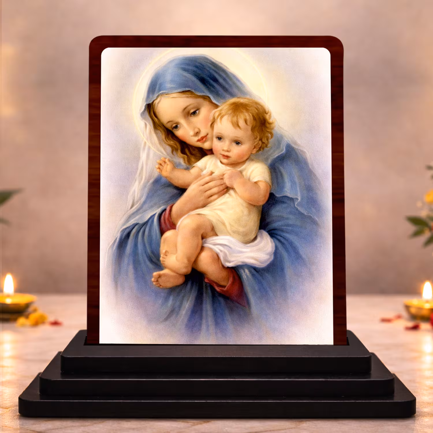 - The neat construction makes it convenient for daily display, while the sacred portrait artwork adds warmth and faith. The overall look reflects warm festive tones.
