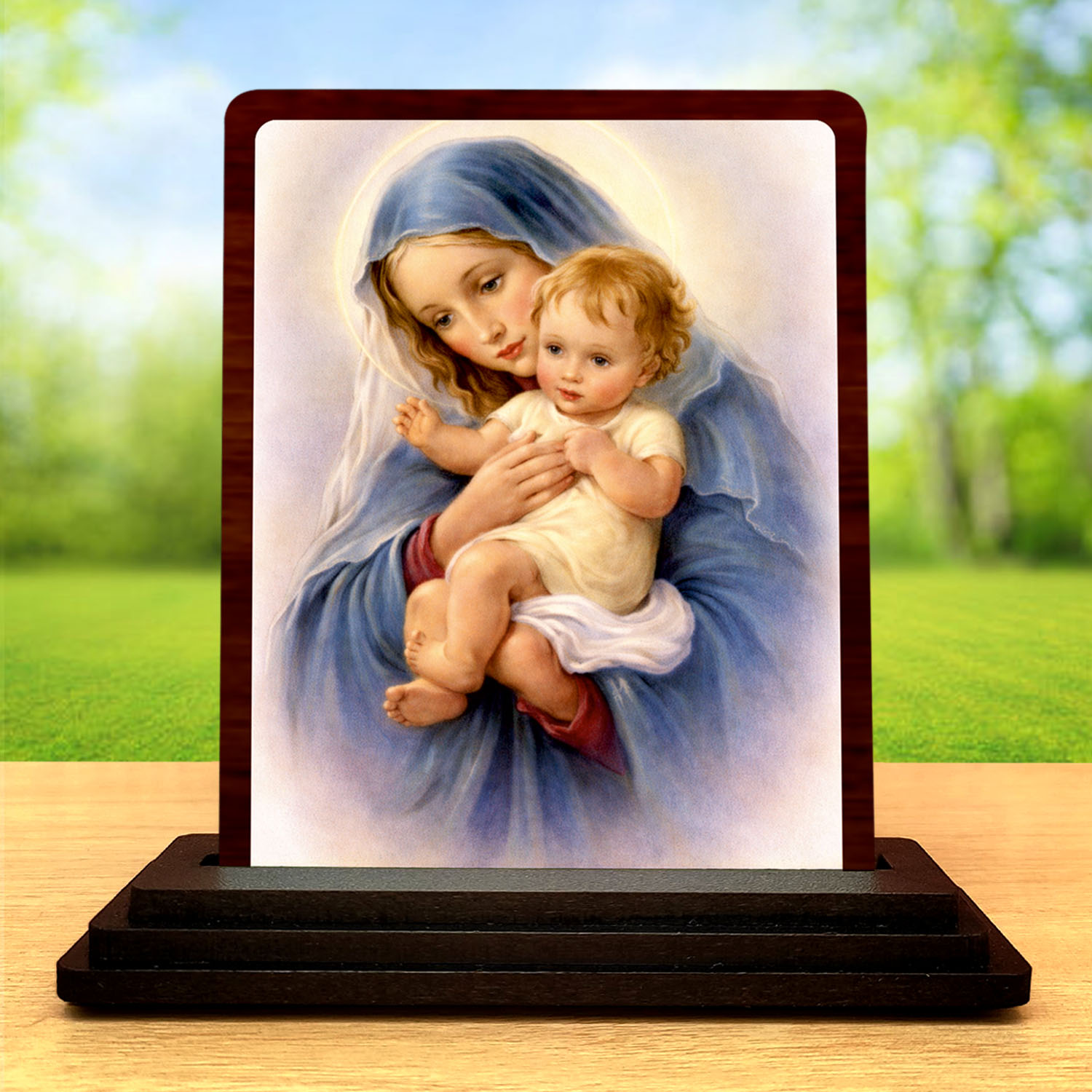 Home » Shop » HD Printed Mother Mary with Child Wooden Idol 3×4 Inch Sacred Portrait Spiritual Showpiece