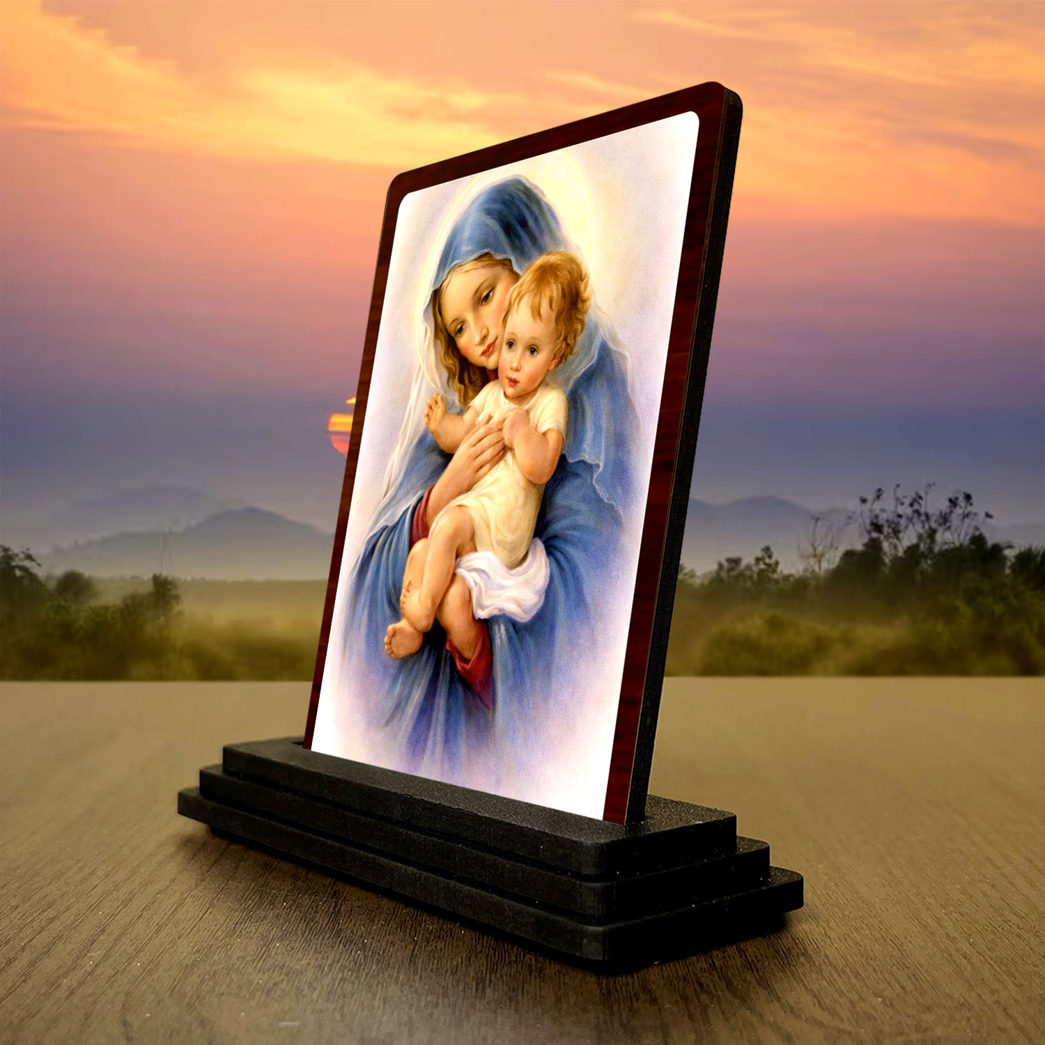 - Crisp HD printing helps this Mother Mary with Child idol stand out with a clean finish and sacred portrait spiritual character. It carries a desk d?cor suitability.