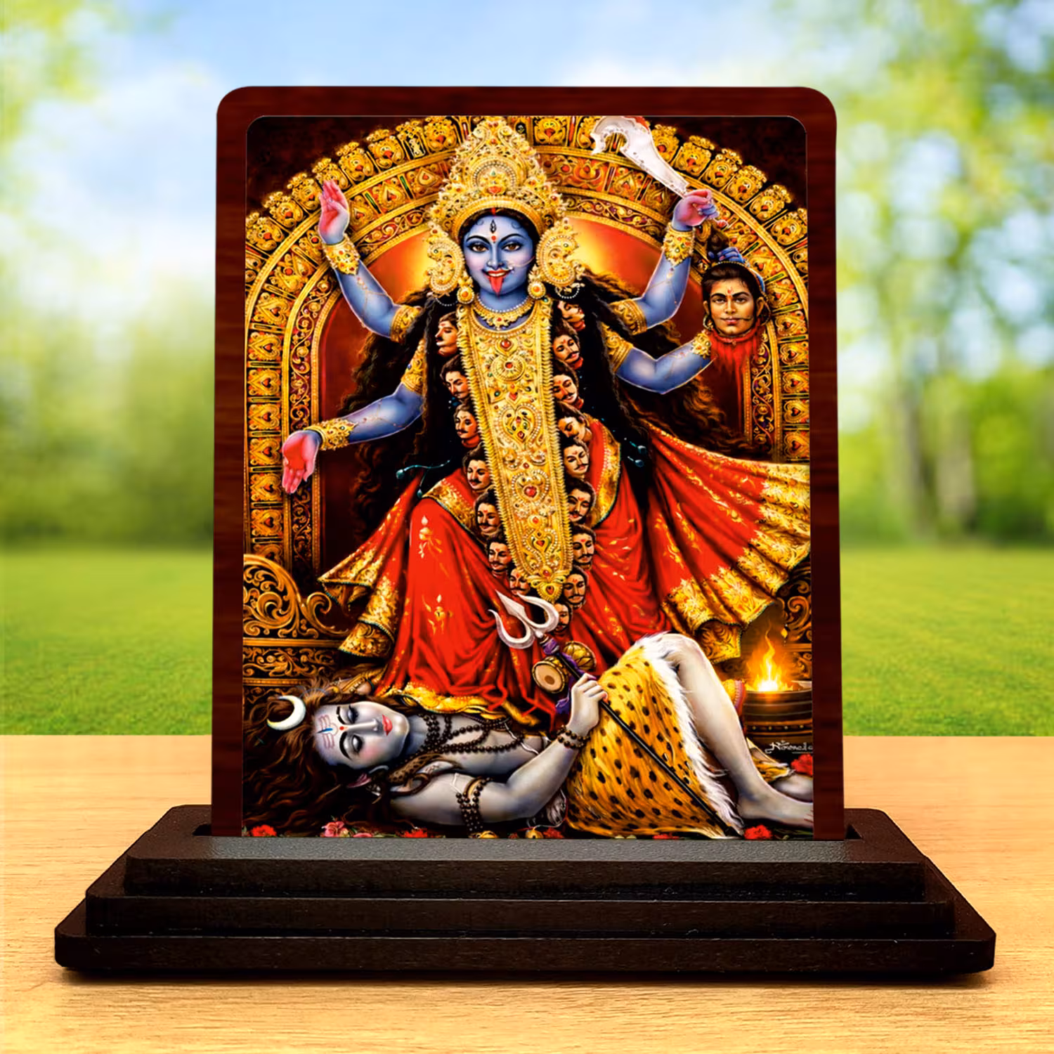 Add a spiritual accent to small spaces with this 3×4 inch Kali Mata wooden idol. The HD print highlights the calm energy artwork beautifully, while the wooden structure keeps it display-friendly for mandir shelves, counters, gifting, and daily devotional use. Its soft spiritual tones and traditional illustration style help the product stand out in compact devotional collections.