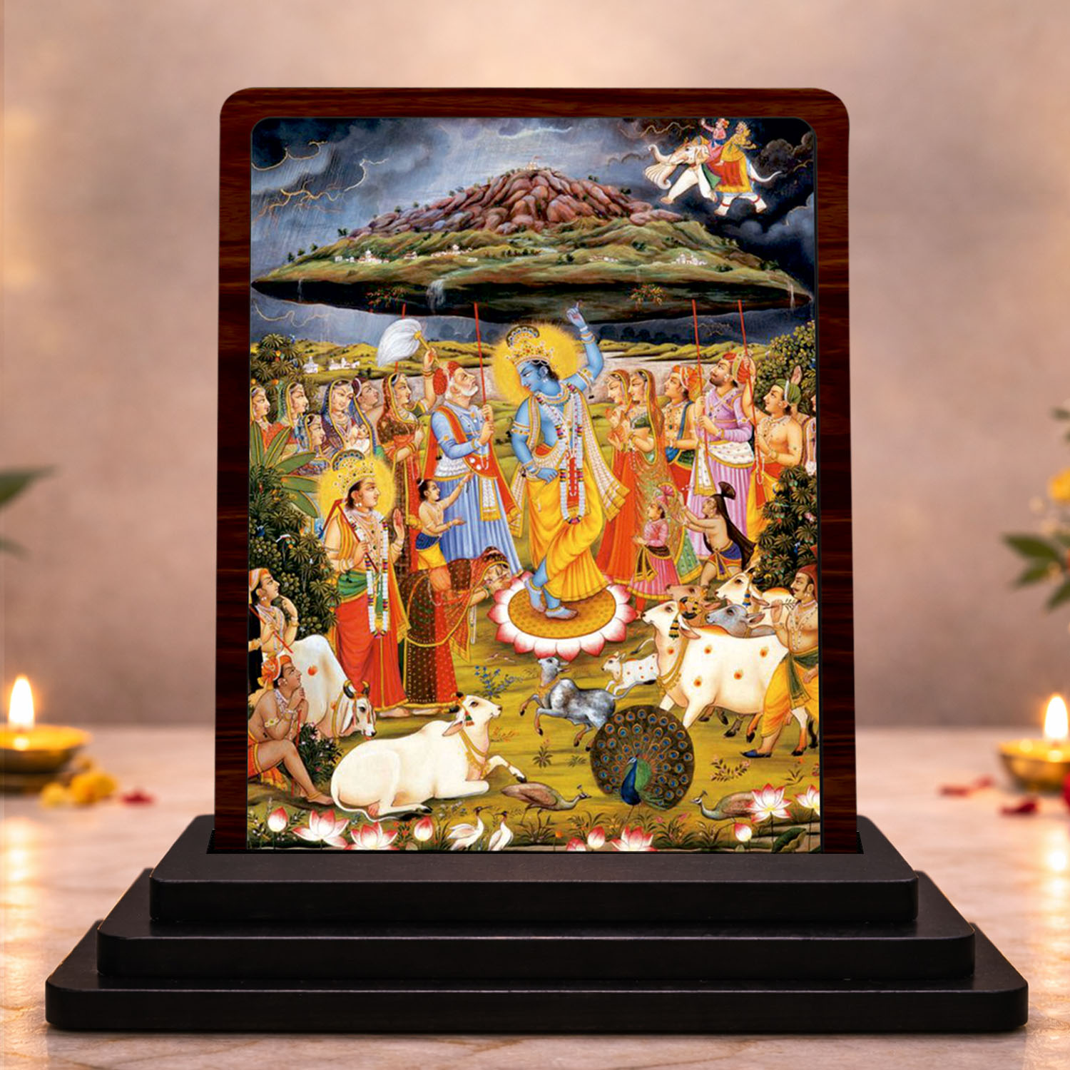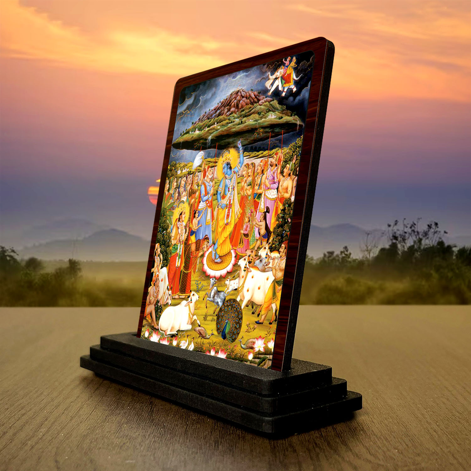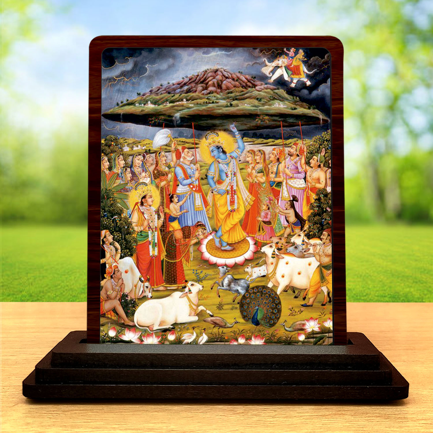 Whatever content for Krishna Leela Sacred Portrait Wooden Idol 3x4 Inch HD Printed Table Decor for Home Temple