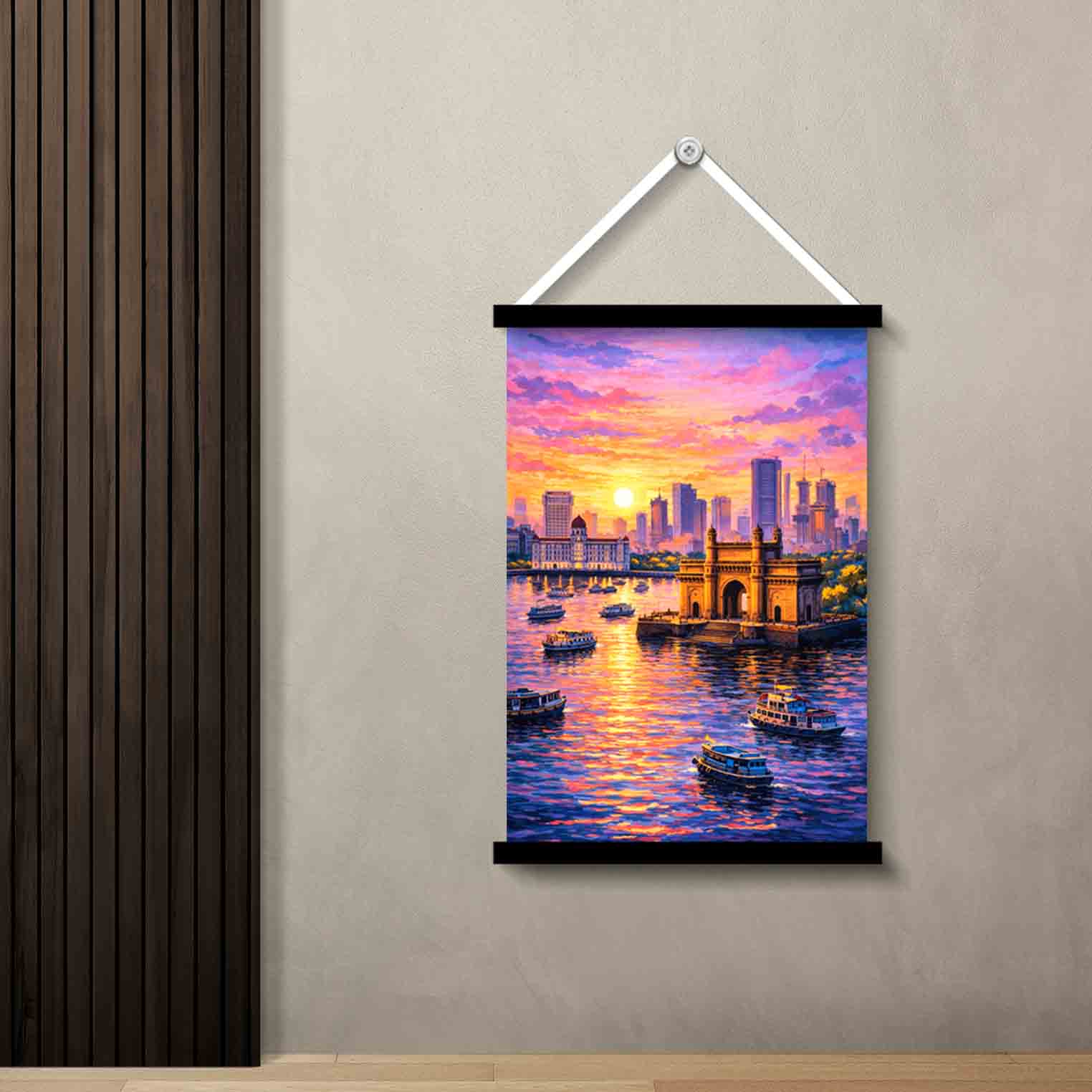 Mumbai Gateway Sunset Wall Art Painting is a decorative wall art piece designed to bring color, mood, and visual depth to your space. This design features a vibrant cityscape showing Mumbai waterfront and Gateway of India at sunset, making it suitable for homes, bedrooms, living rooms, offices, caf?s, hallways, entryways, and gifting. Artwork-led wall d?cor helps instantly uplift an empty wall and adds personality without major interior changes.
