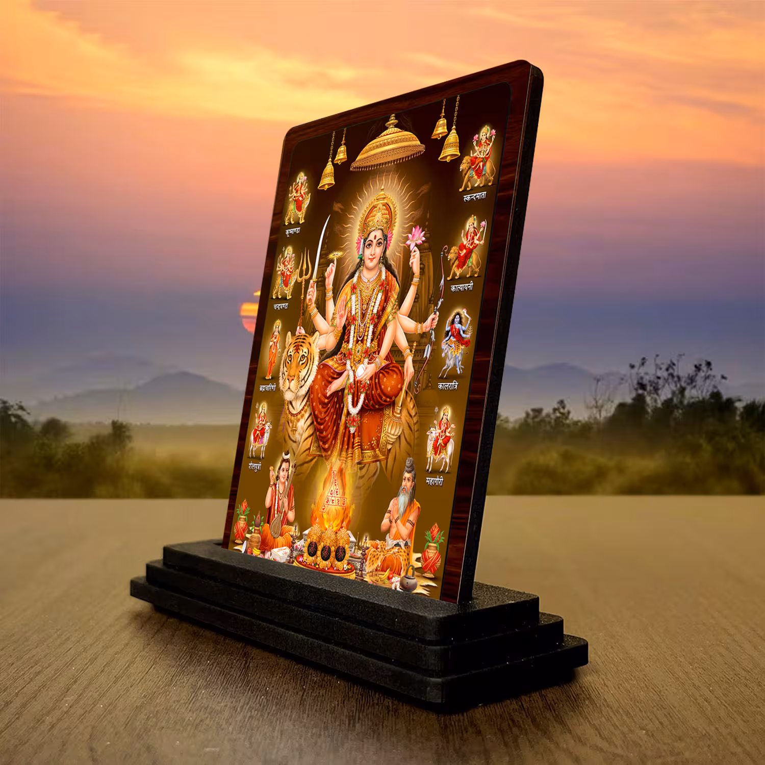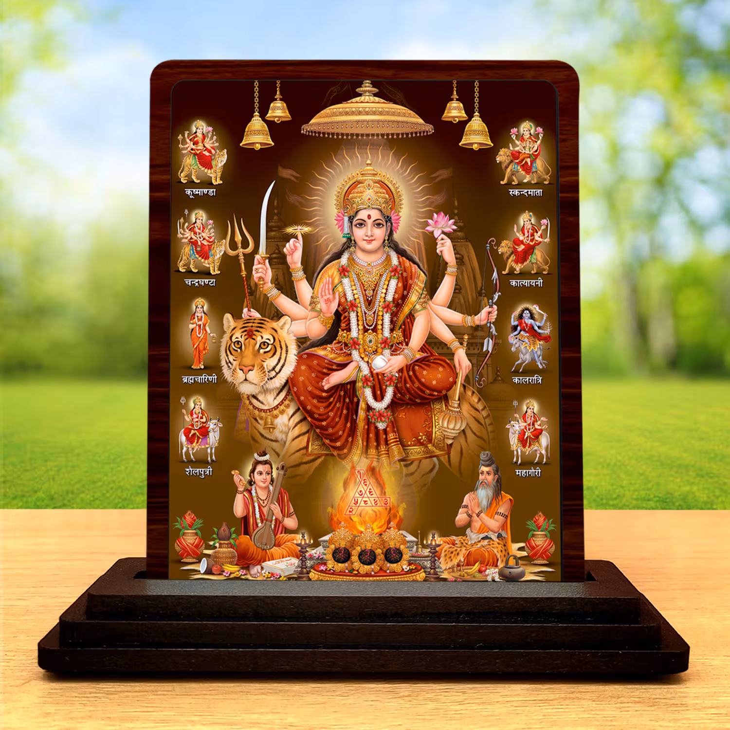 This Navdurga wooden idol is designed for buyers who want a compact yet attractive spiritual article. Built in wood and finished with HD printed ornate frame artwork, the 3 x 4 inch size fits easily in pooja rooms, study tables, workspaces, and religious gift hampers. Its calm meditative look and collector-friendly appearance help the product stand out in compact devotional collections.