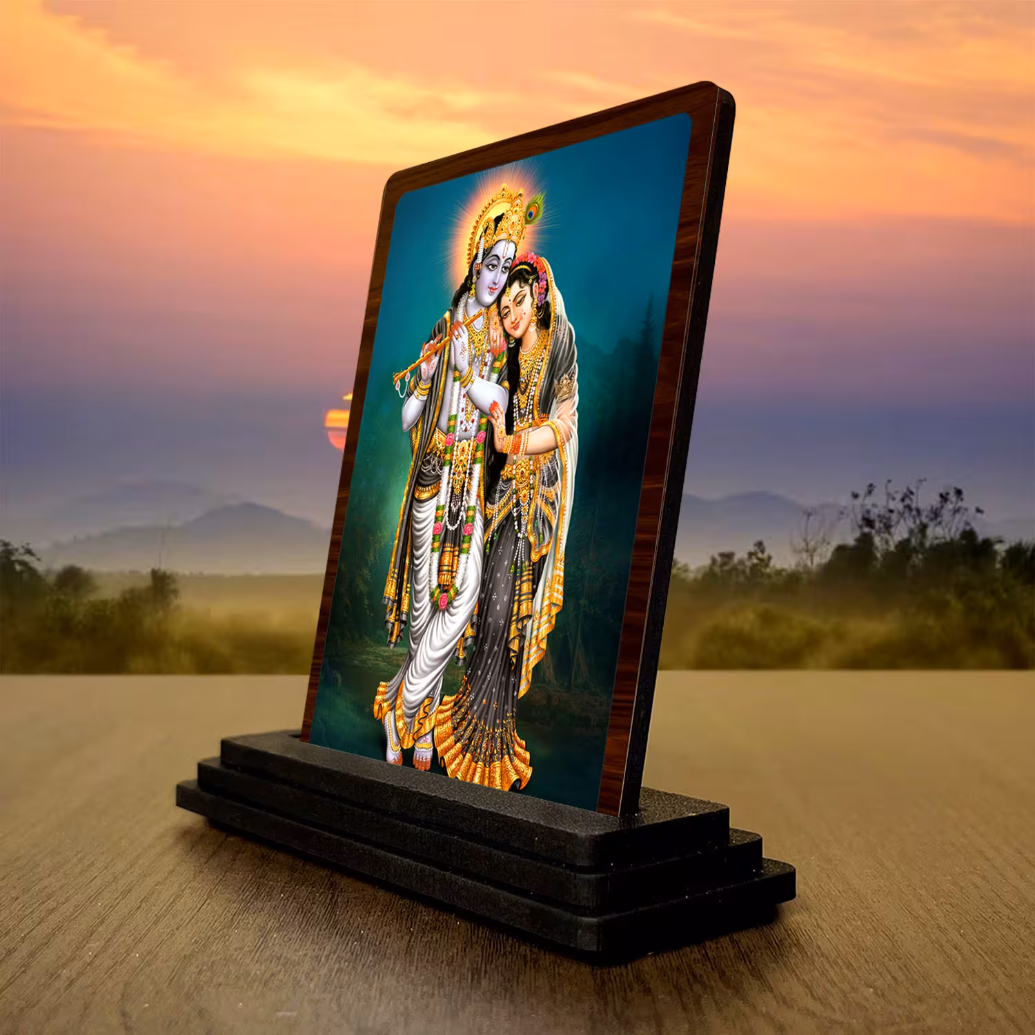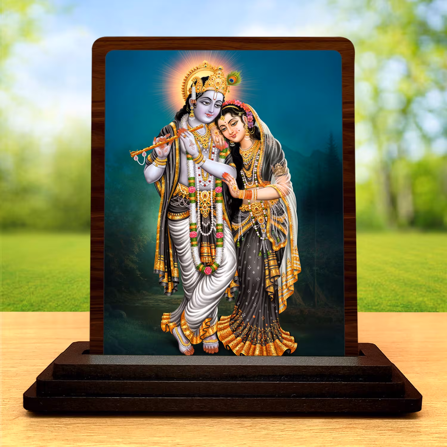 This Radha Krishna wooden idol is designed for buyers who want a compact yet attractive spiritual article. Built in wood and finished with HD printed vibrant devotion artwork, the 3 x 4 inch size fits easily in pooja rooms, study tables, workspaces, and religious gift hampers. Its classic portrait detailing and gift-friendly presentation help the product stand out in compact devotional collections.