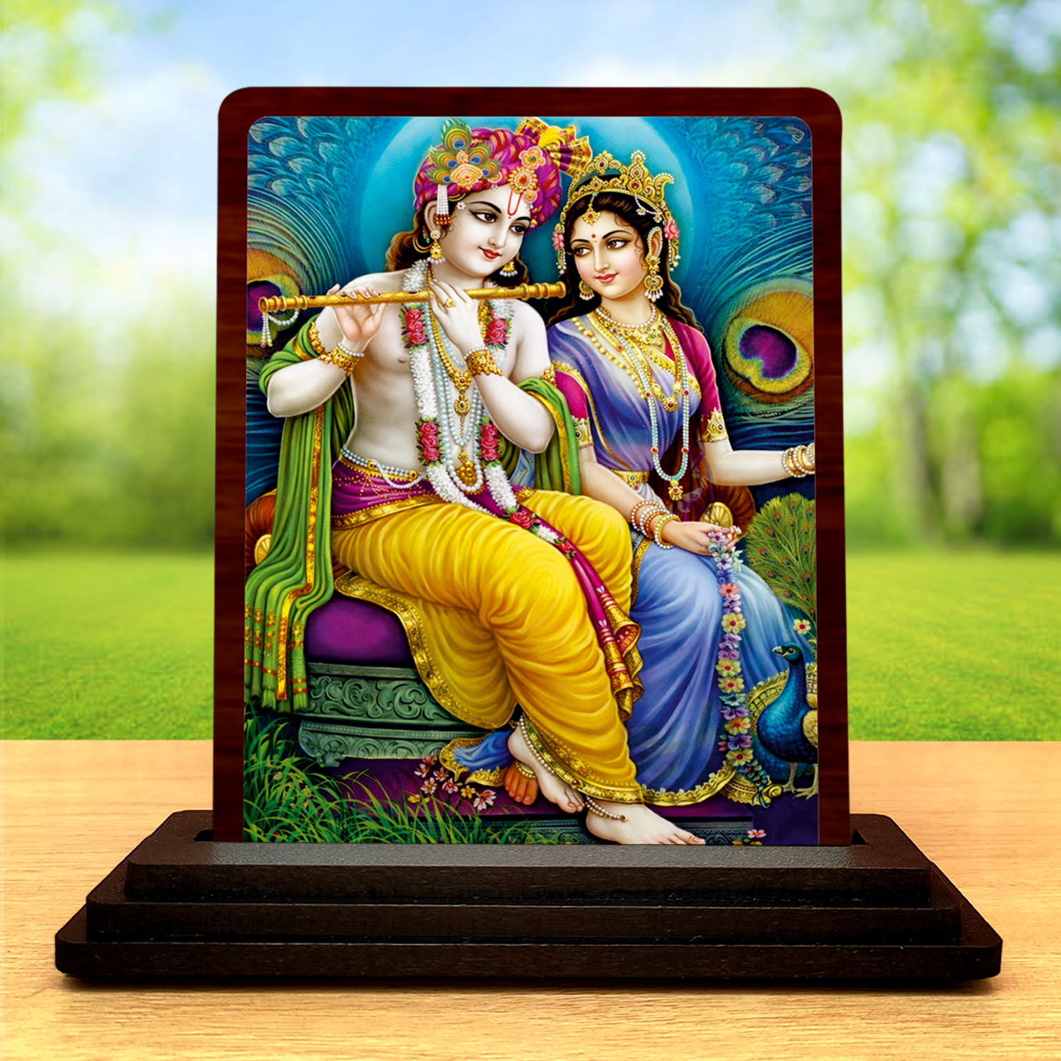 Celebrate faith in a compact format with this Radha Krishna wooden idol. With its 3 x 4 inch size, wooden build, and HD printed spiritual art artwork, it offers a neat solution for pooja spaces, office tables, home d?cor themes, and thoughtful religious gifting. Its soft spiritual tones and compact display appeal help the product stand out in compact devotional collections.