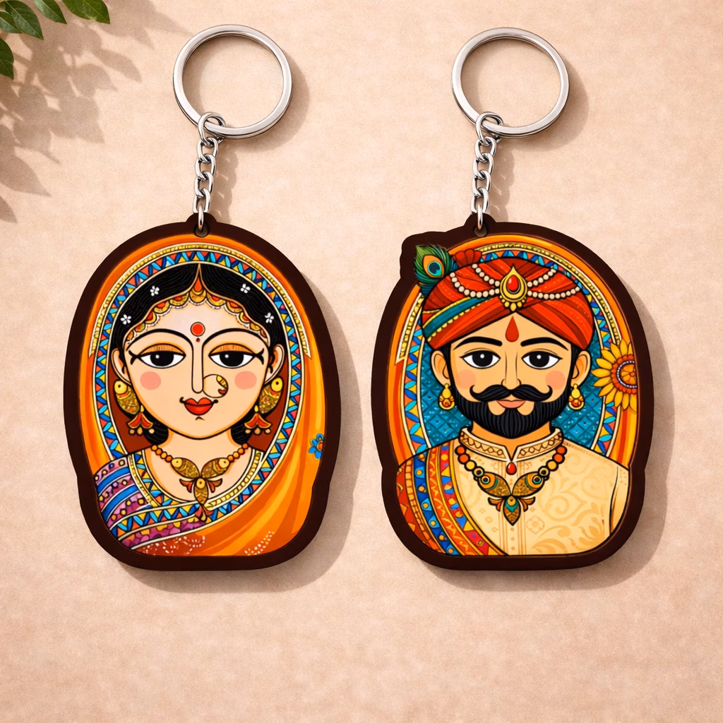 Rajasthani Couple Keychain | Traditional Indian Art Keyring by Vprint Quality is designed for shoppers who want more personality in everyday accessories. This design features a richly detailed royal-style Rajasthani couple portrait with bright colors, ornate patterns and heritage-inspired artistry. If you are searching for a folk art keychain that feels stylish, expressive and gift-ready, this product is made to deliver that exact balance. Whether you attach it to home keys, office keys, backpacks, handbags, pouches, travel organizers or zipper pulls, this keychain adds visible character in a compact form. The artwork feels instantly noticeable without becoming bulky, which makes it ideal for people who love accessories that say something about their mood, taste or lifestyle.