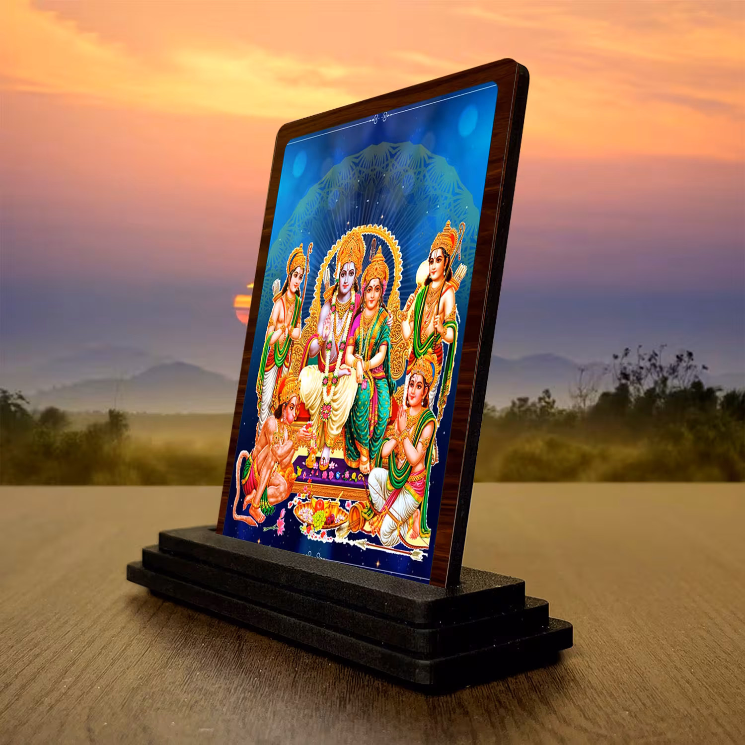 This Ram Darbar wooden idol is designed for buyers who want a compact yet attractive spiritual article. Built in wood and finished with HD printed traditional pooja artwork, the 3 x 4 inch size fits easily in pooja rooms, study tables, workspaces, and religious gift hampers. Its warm festive tones and collector-friendly appearance help the product stand out in compact devotional collections.