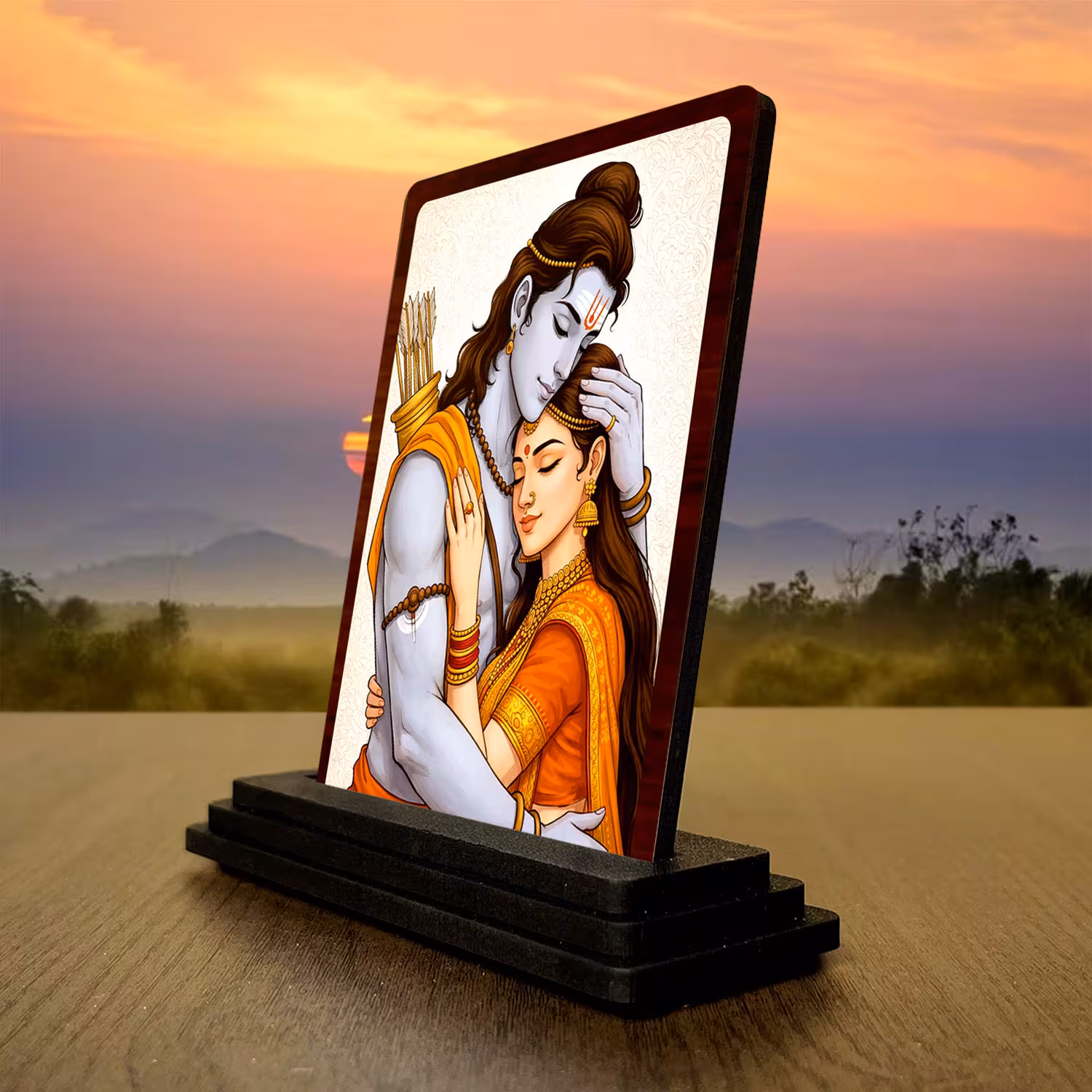 Bring devotional warmth to your surroundings with this Ram Sita wooden idol in a compact 3 x 4 inch size. The HD printed classic devotional artwork creates a bright and graceful finish on wood, making it suitable for home temples, office desks, side shelves, and festive gifting. Its warm festive tones and front-facing artwork help the product stand out in compact devotional collections.