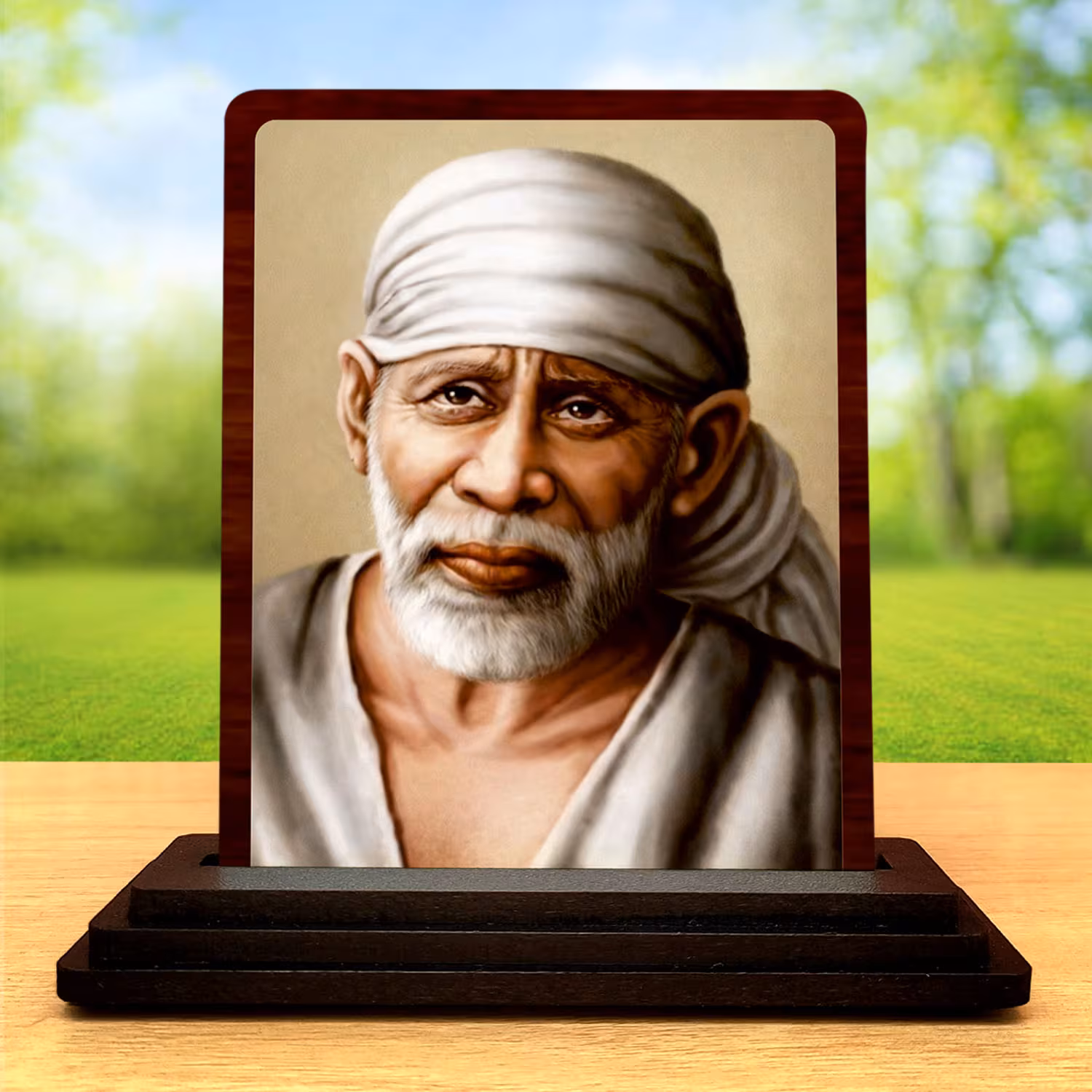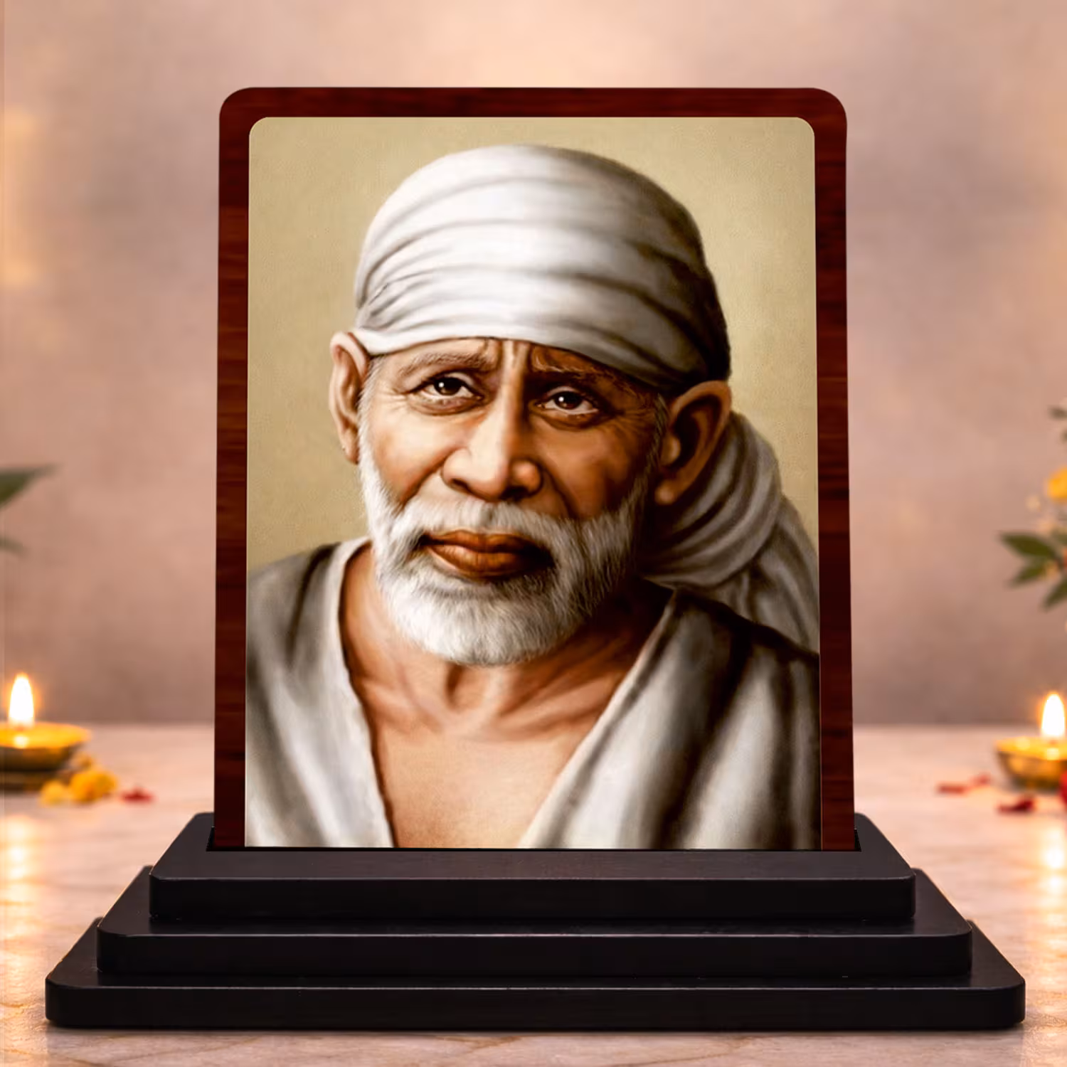 Bring devotional warmth to your surroundings with this Sai Baba wooden idol in a compact 3 x 4 inch size. The HD printed golden glow artwork creates a bright and graceful finish on wood, making it suitable for home temples, office desks, side shelves, and festive gifting. Its ornate art styling and mandir-ready look help the product stand out in compact devotional collections.