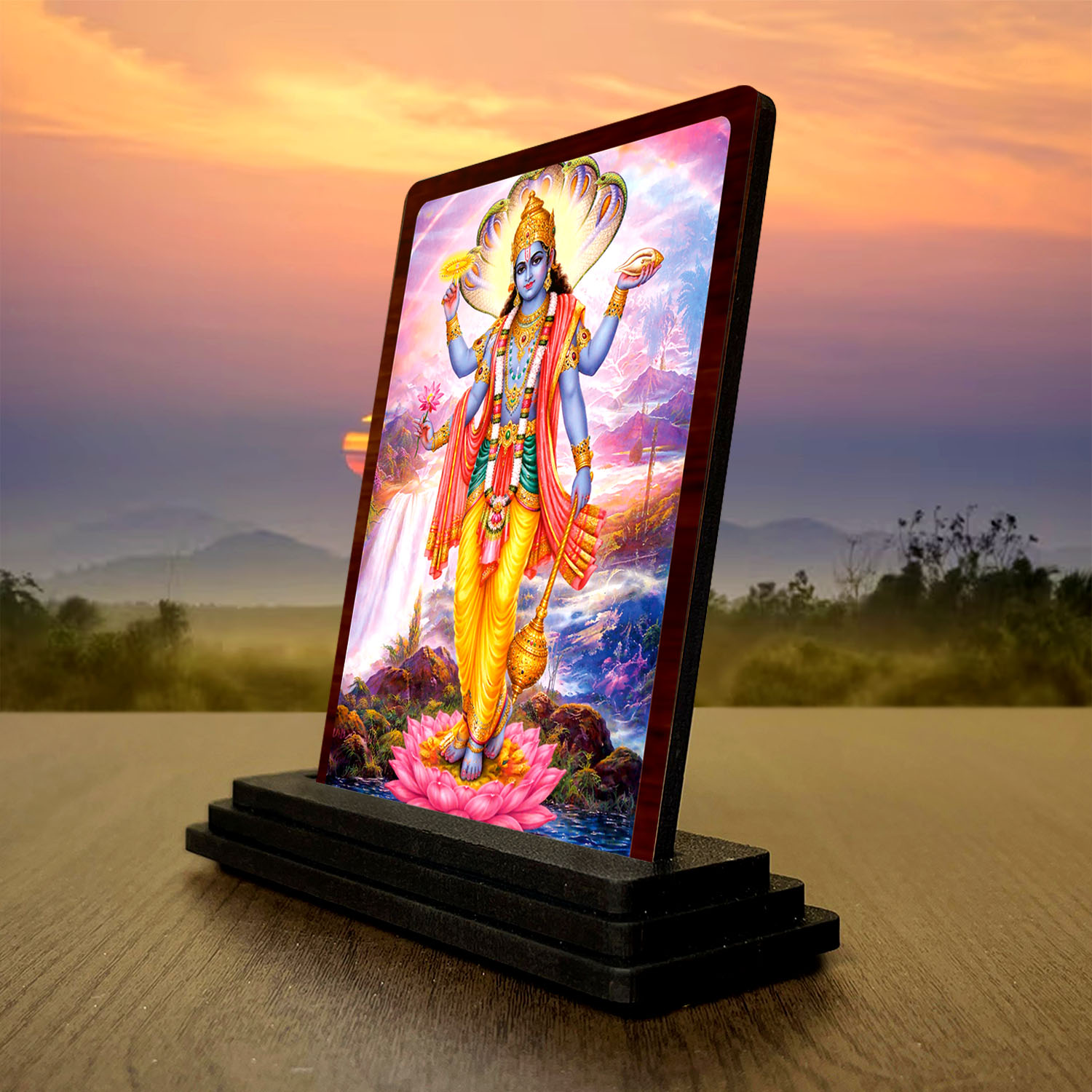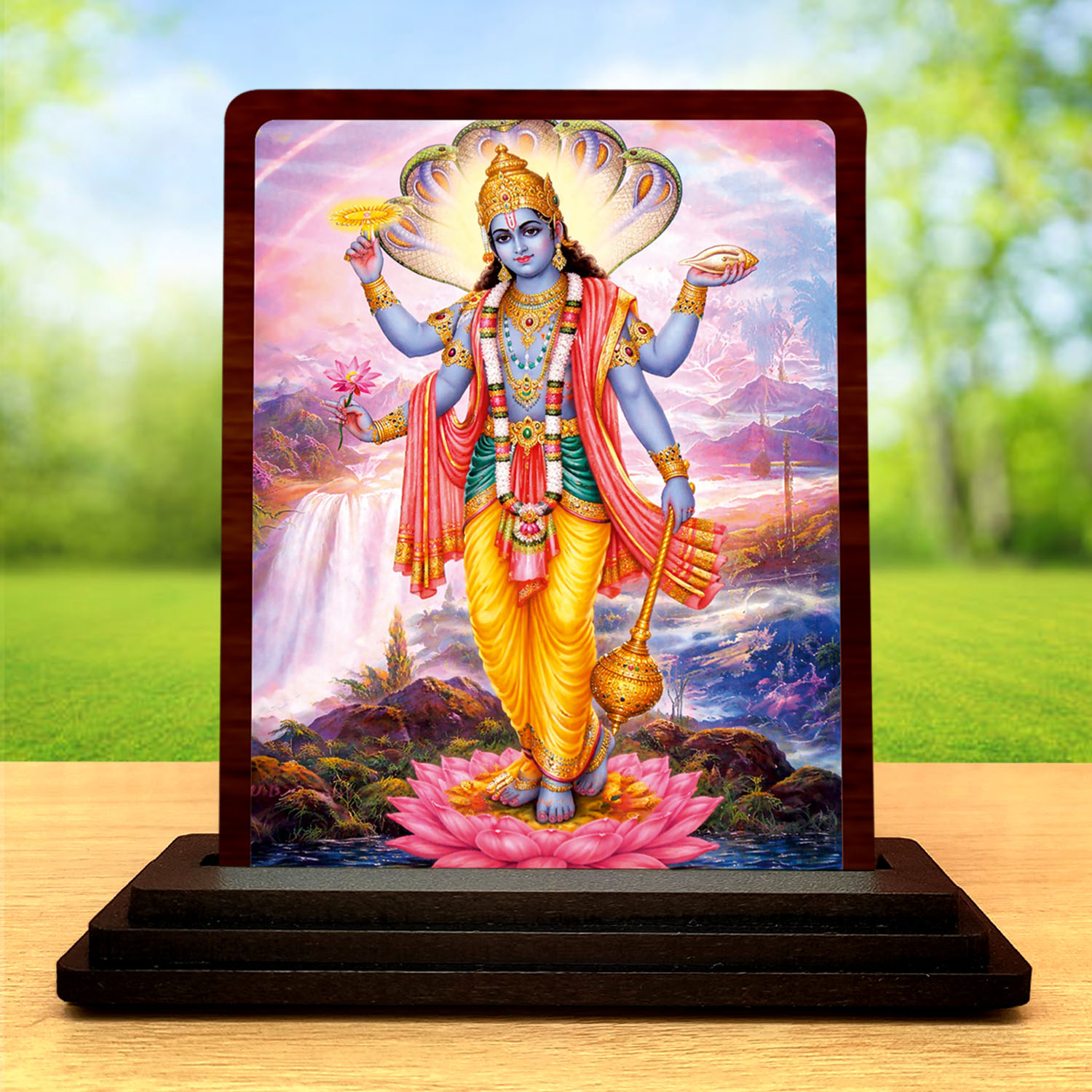 • The high-definition print captures the Lord Vishnu artwork with clear details, rich color balance, and a spiritual art look. It carries a compact display appeal.