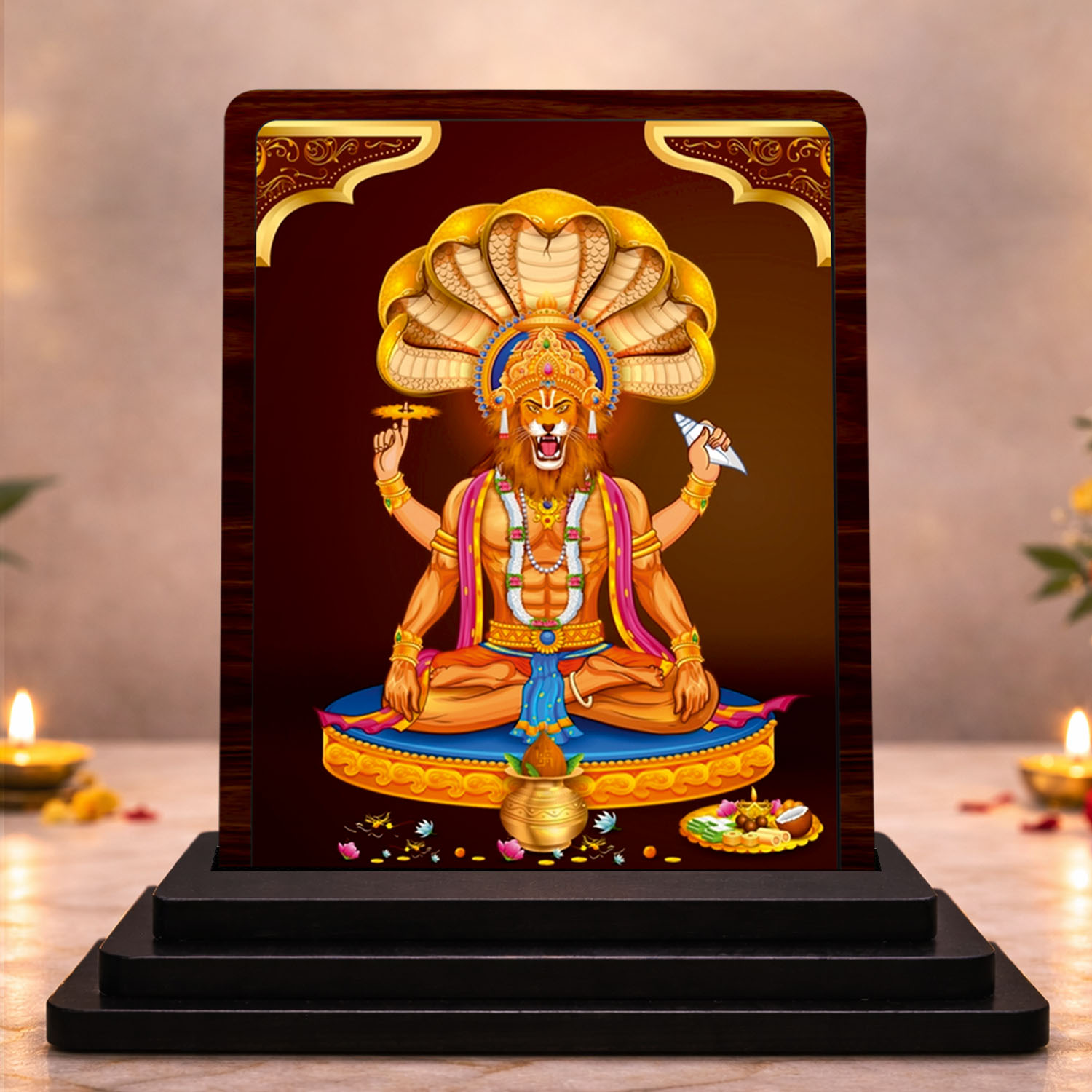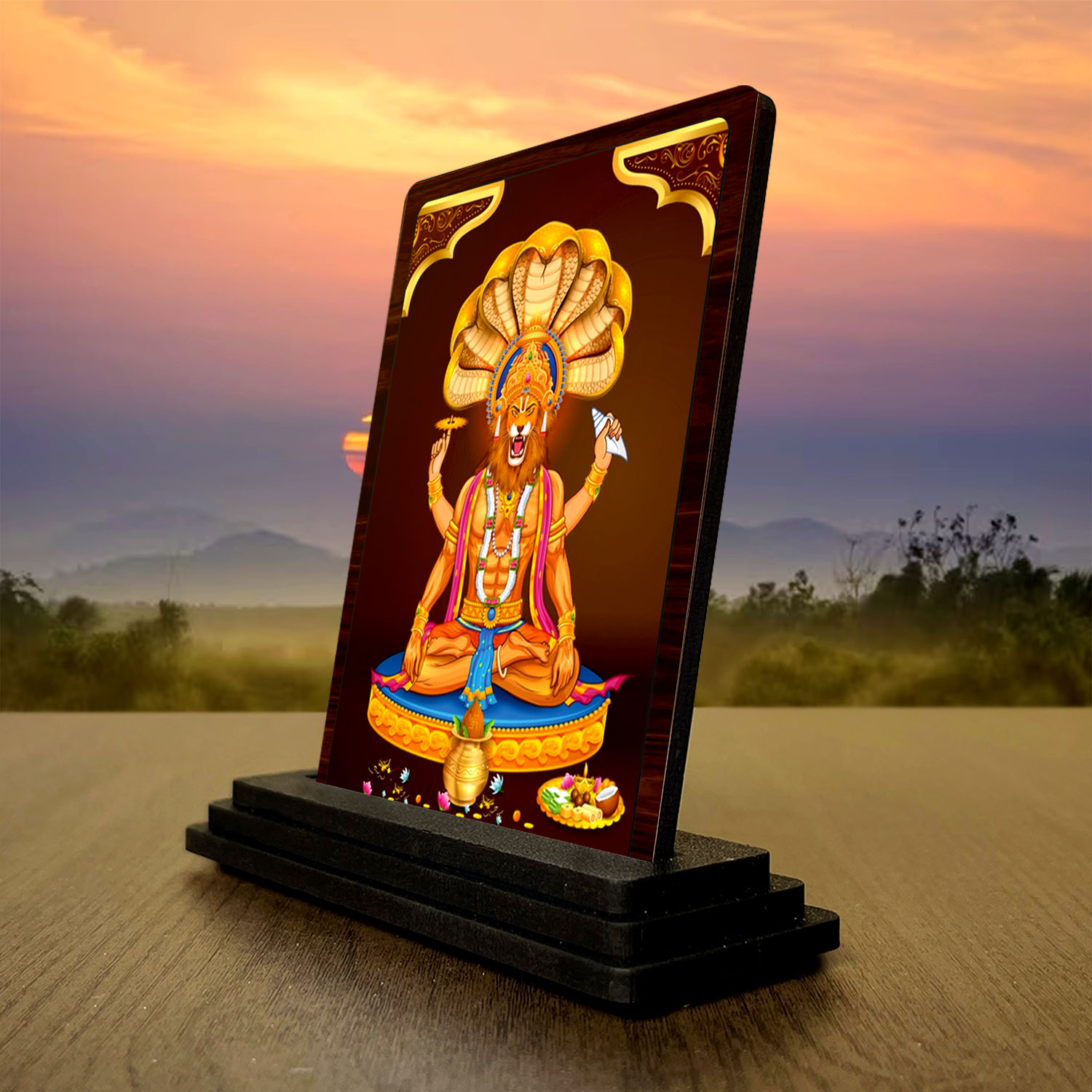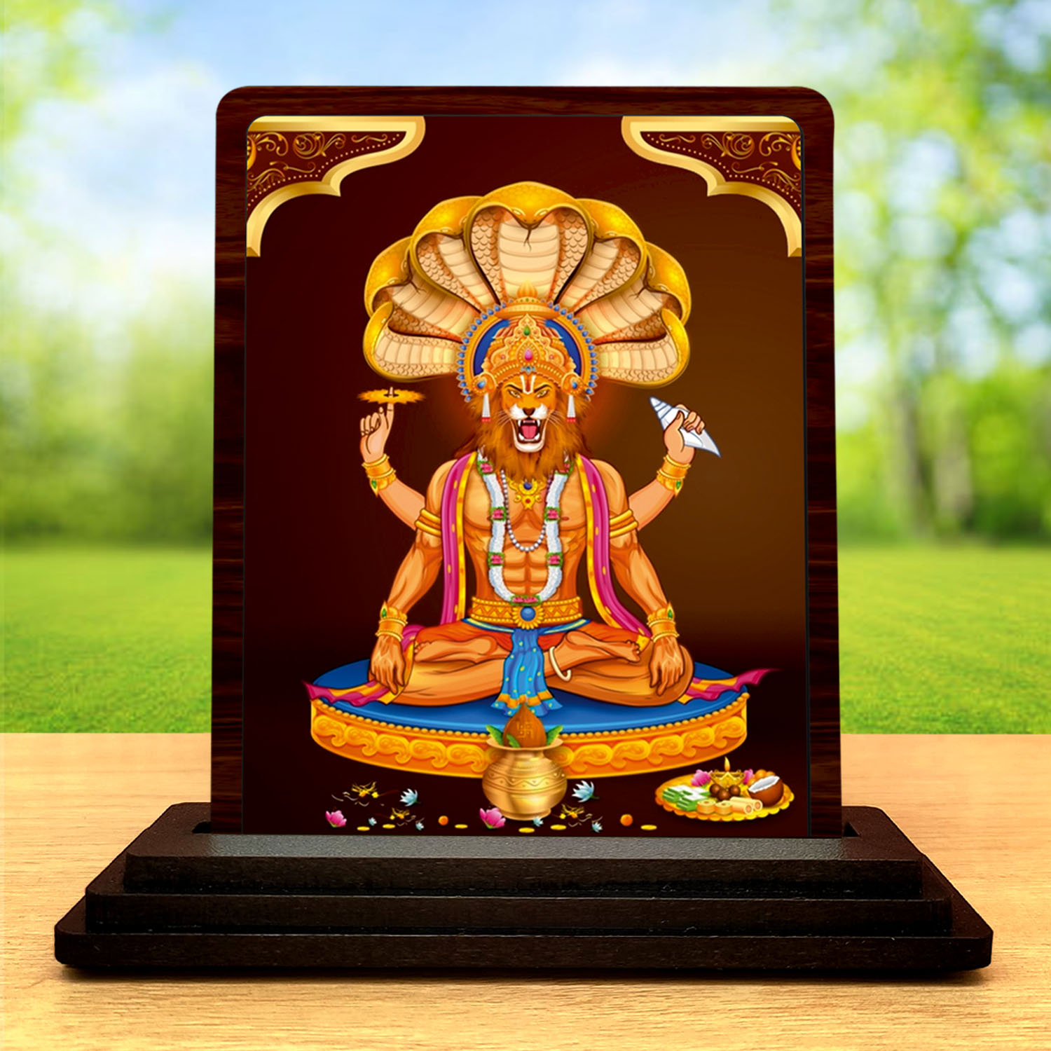 Made for compact display and devotional styling, this Nag Devta wooden idol combines a sturdy wooden body with HD printed temple gift artwork. It is a suitable choice for prayer corners, home d?cor, festive gifting, and customers who prefer spiritual products in smaller sizes. Its elegant blessing theme and clean printed finish help the product stand out in compact devotional collections.