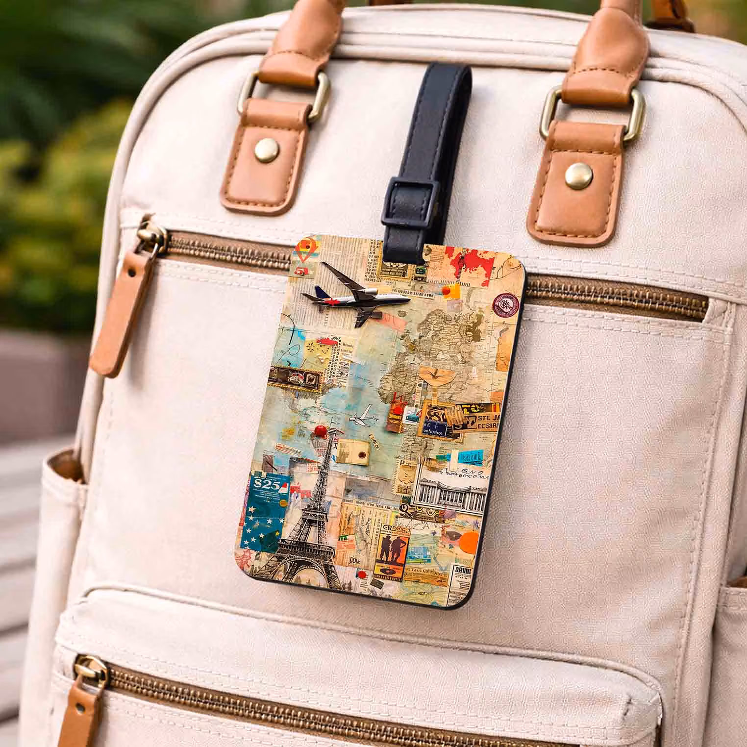 Travel Collage & Europe Landmarks Luggage Tags Set of 2 is designed for travelers who want a stylish, easy-to-spot, and practical way to identify their luggage. This set features 2 wooden luggage tags with a detailed world-travel collage matched with a vintage Europe monuments style print, giving your suitcase, backpack, duffel bag, cabin bag, school bag, or trolley a more personal and travel-ready look. Each tag is approximately 7 x 9.5 cm, which makes it large enough to notice quickly on a moving baggage belt while still staying compact, lightweight, and comfortable to attach.